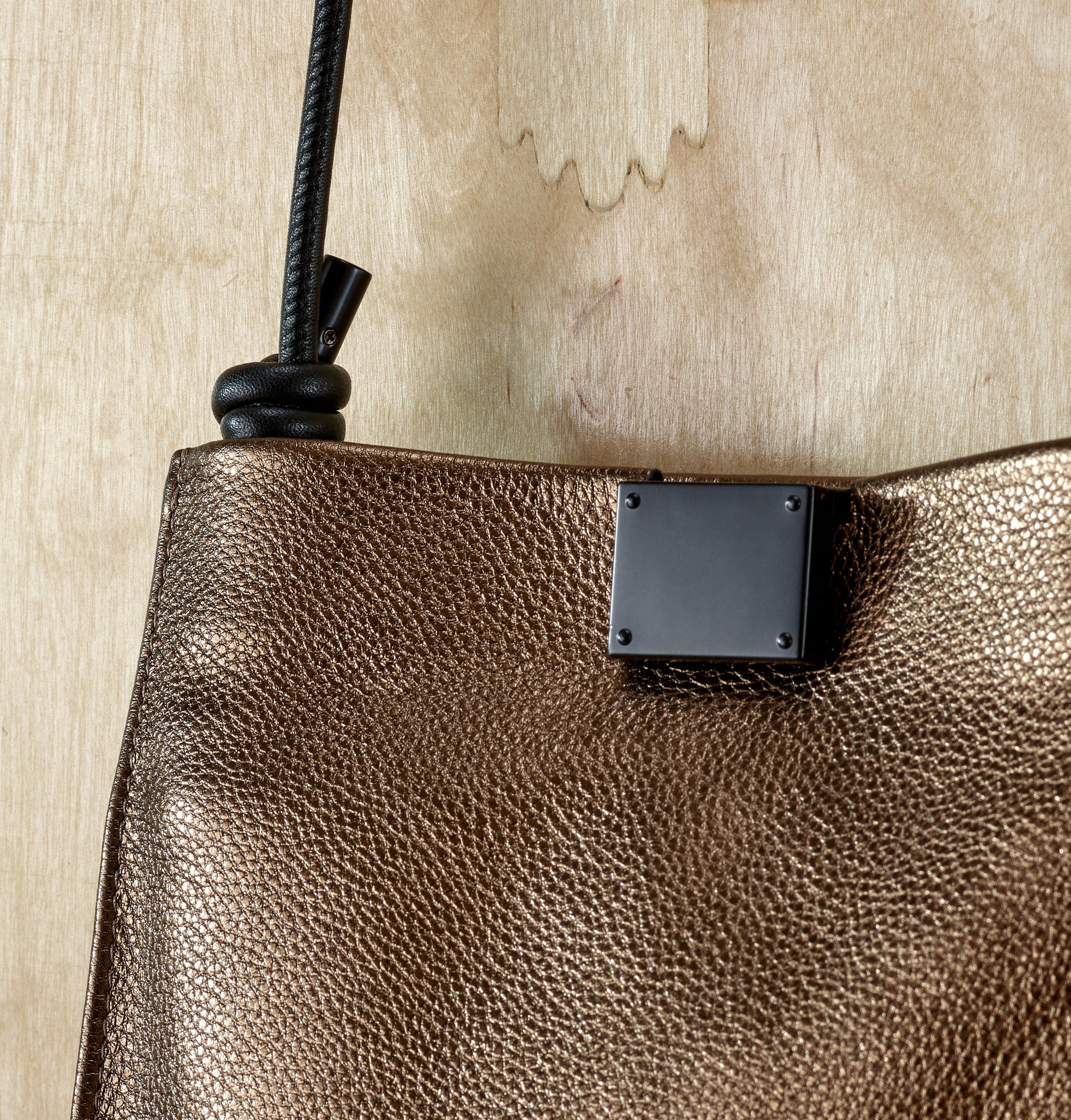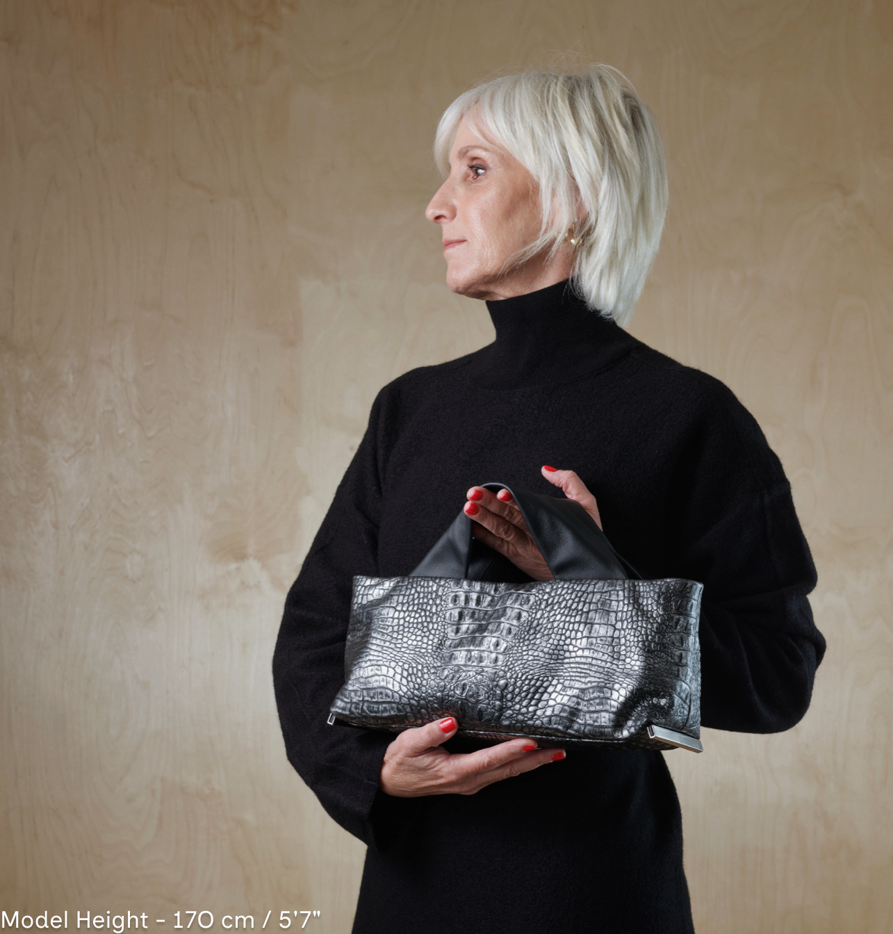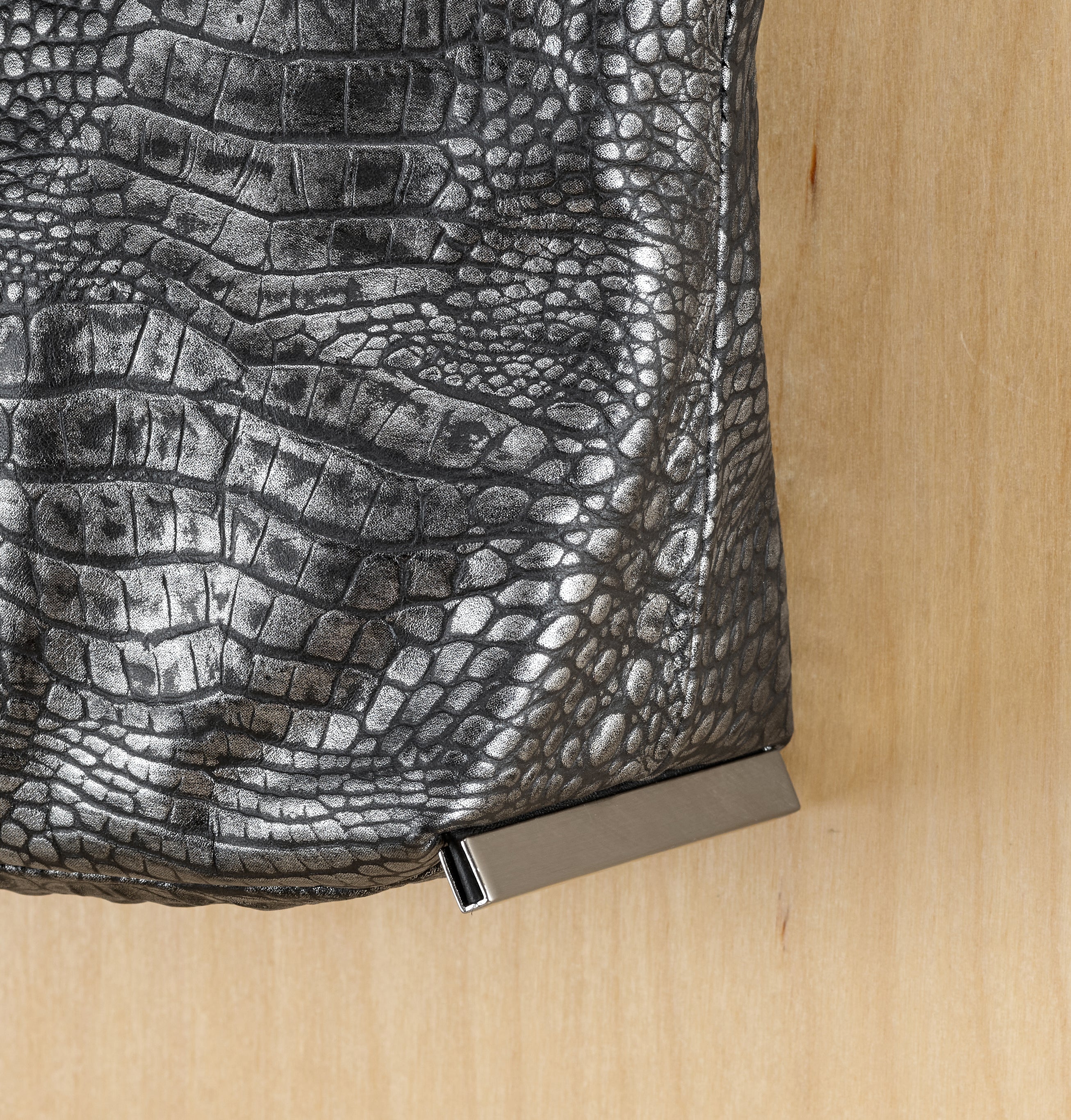 A small evening bag that brings a clean, industrial approach-perfect for anyone who prefers minimalism without excessive shine.