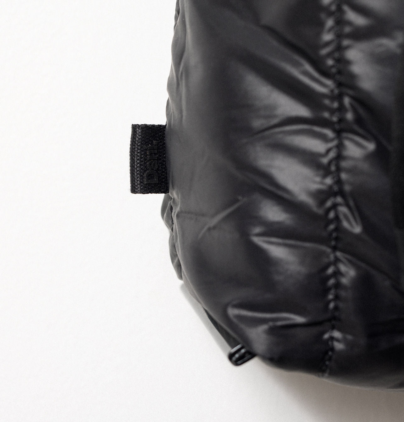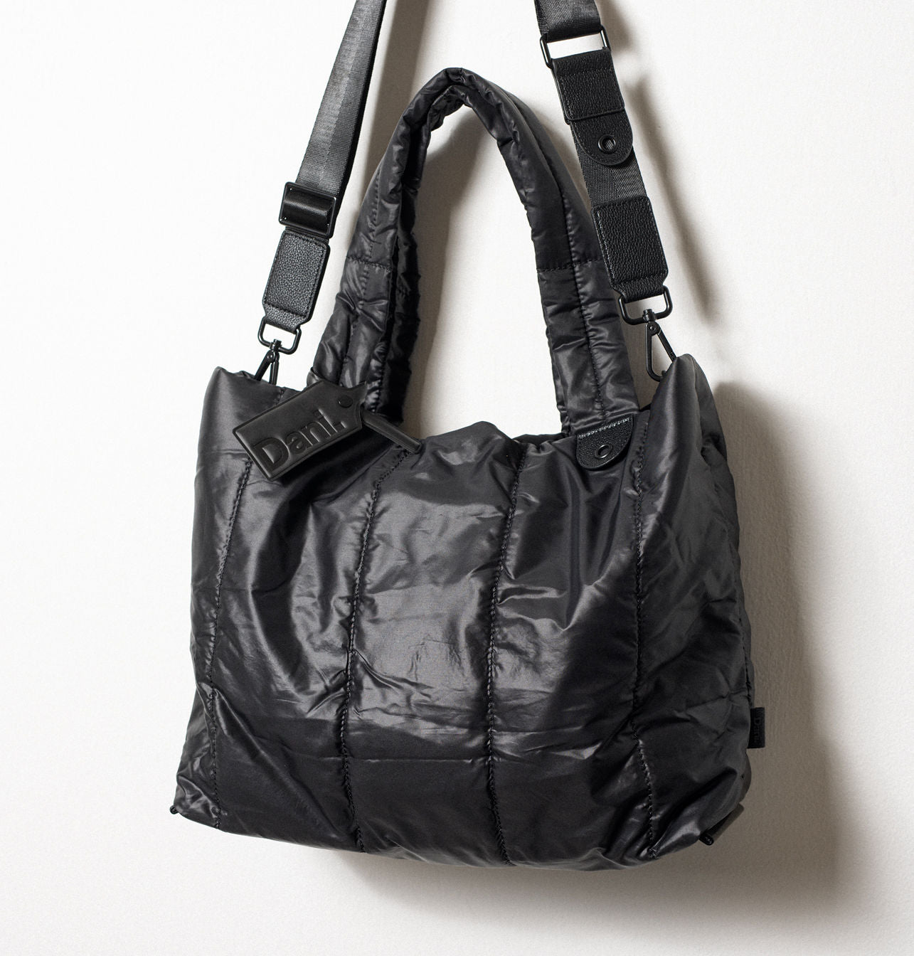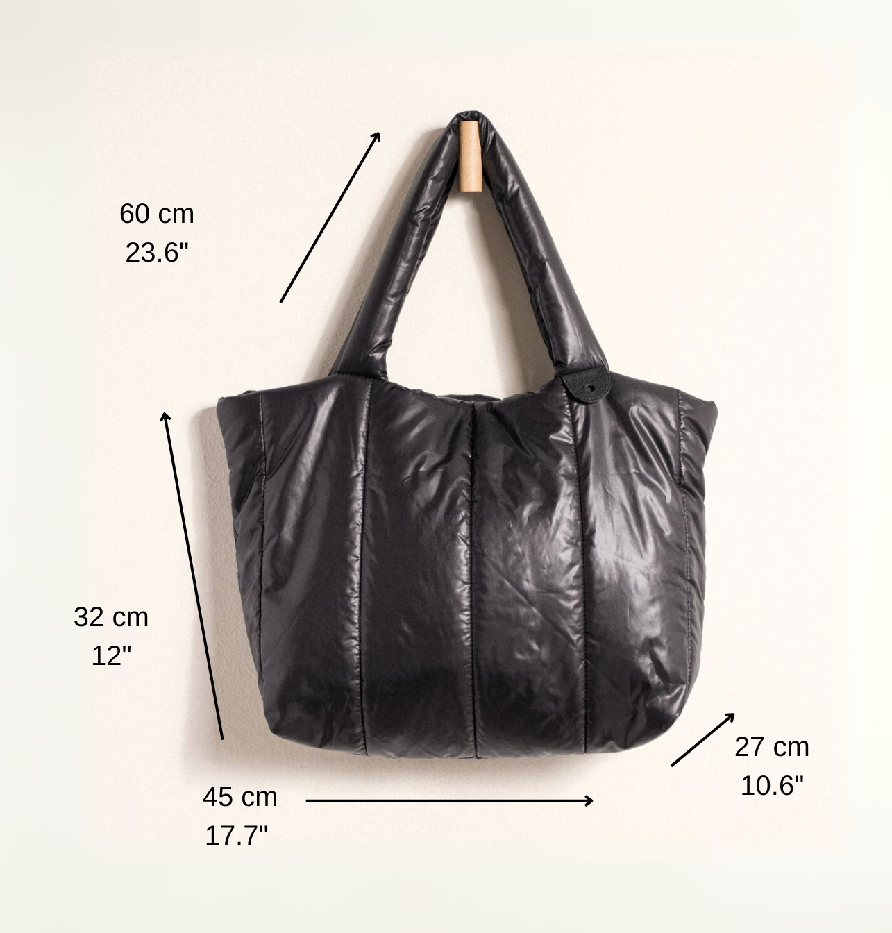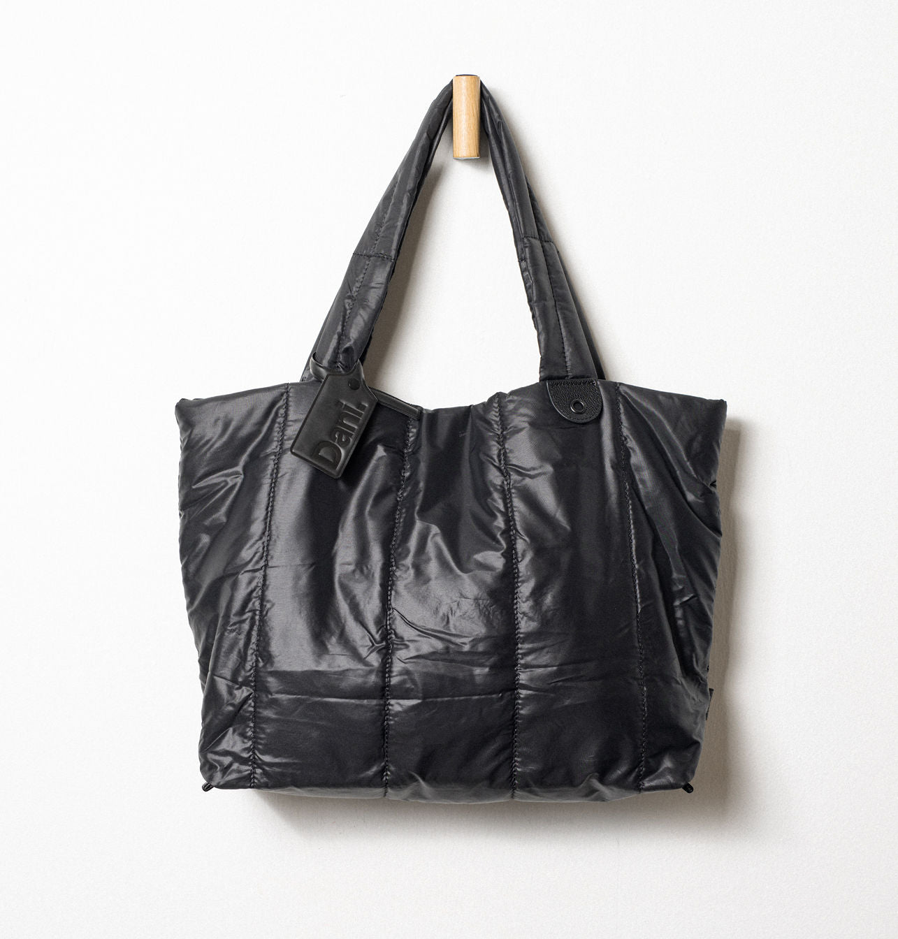 The Quilt Large Tote bag is crafted from recycled vegan Nylon, offering a sustainable yet luxurious touch. Its soft quilted texture adds dimension and a subtle sheen. The bag has one spacious main compartment that could carry a 13" laptop and a small zipped inside pocket.