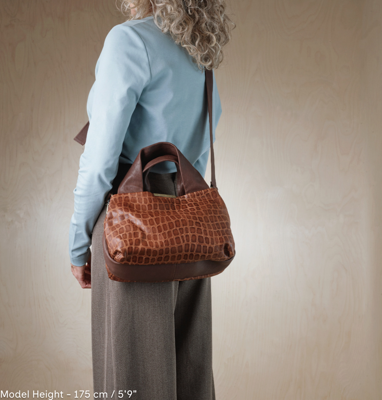 You can carry it by hand or over the shoulder, thanks to its adjustable, detachable leather strap. The exterior features a geometric croco-inspired texture, adding subtle depth and a touch of distinction to its timeless design.