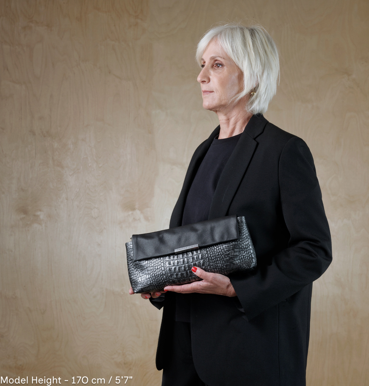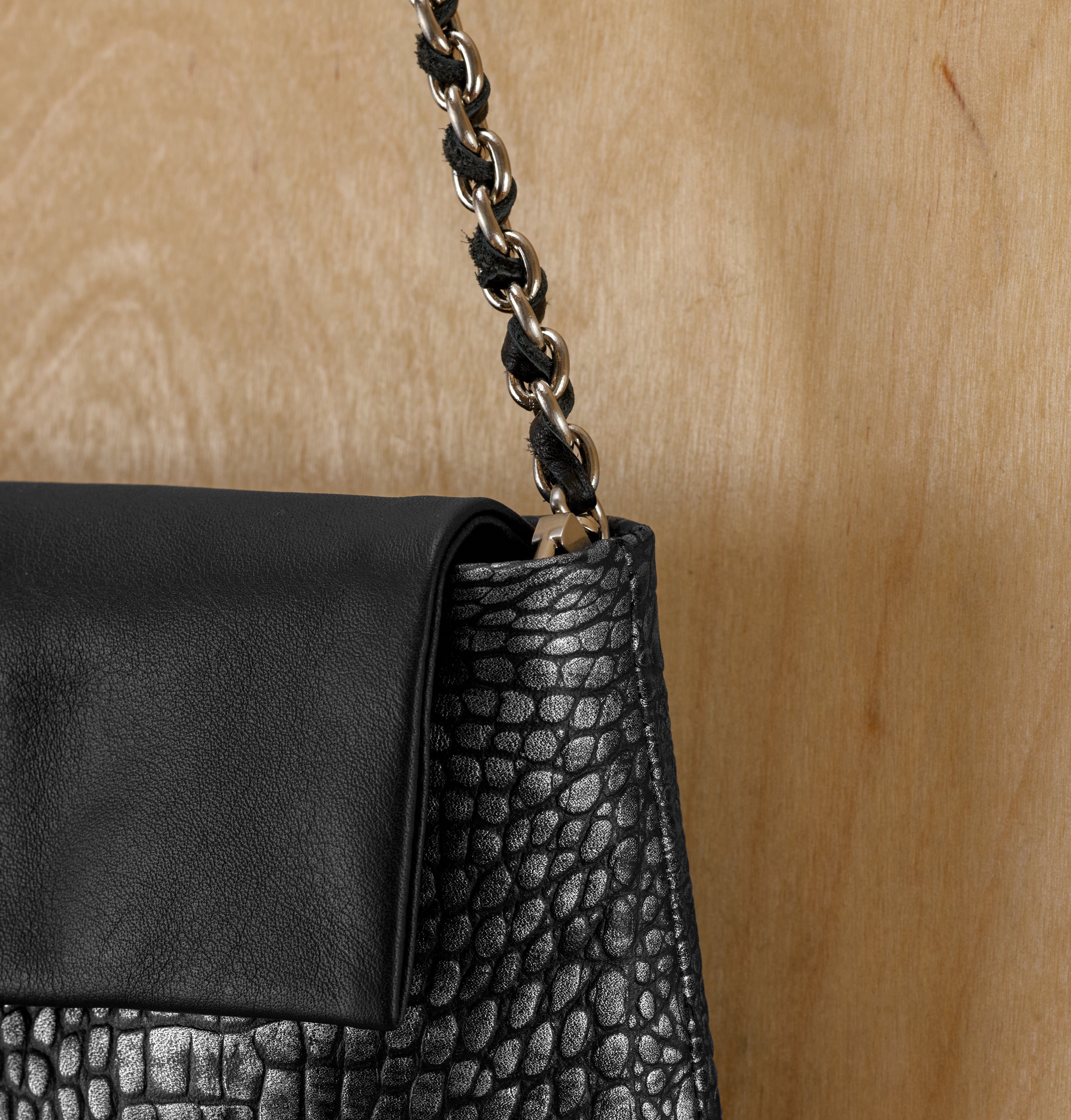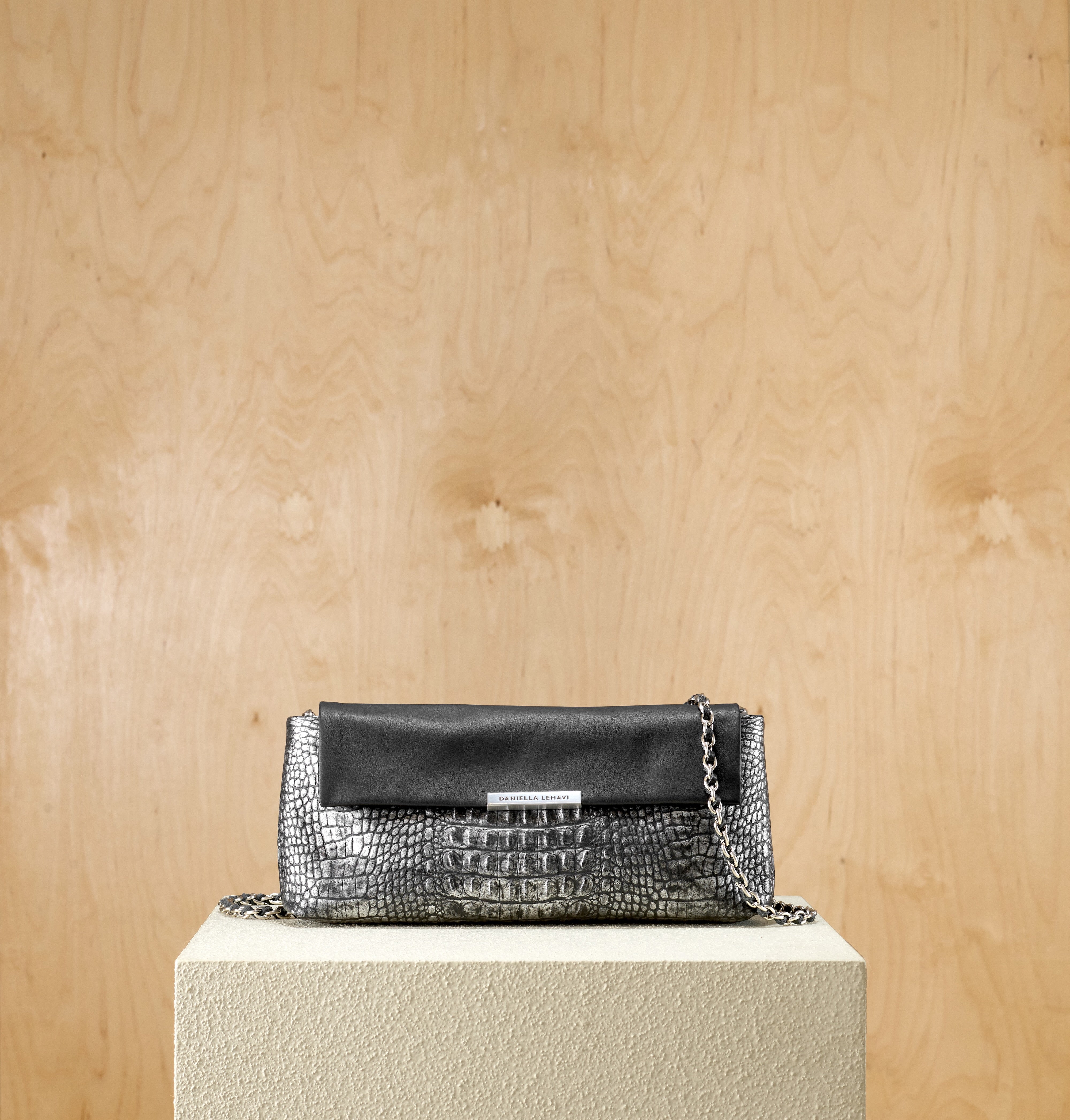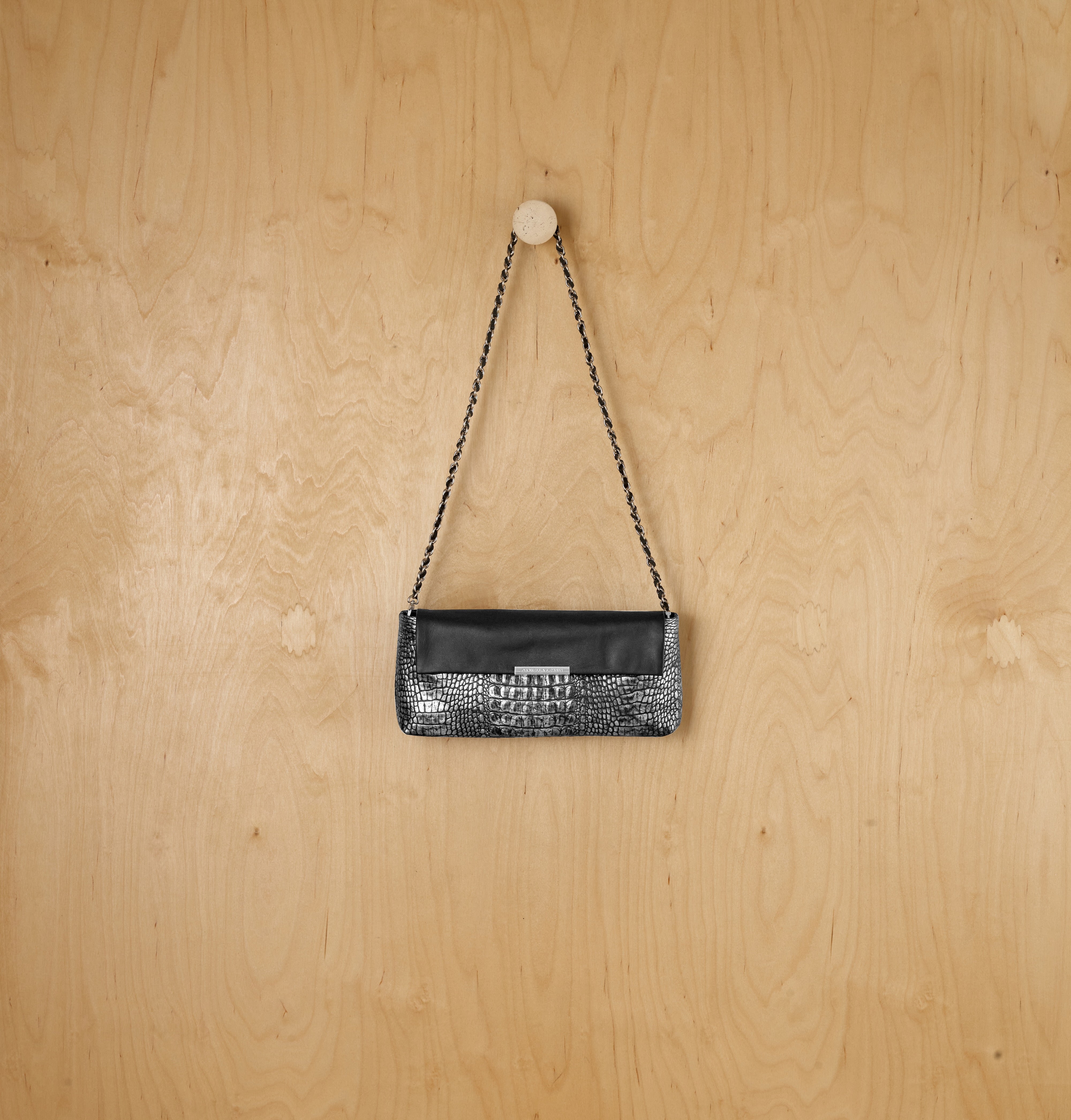An elongated clutch with clean lines that brings a sense of quiet elegance. The interplay of textures creates subtle material depth, while its balanced structure maintains a refined look and offers practical internal volume. The chain strap adds a contemporary metallic touch, tracing the silhouette with clarity and softness. It works beautifully both when worn close to the body and when carried as a handheld clutch, remaining clean and precise in any form.