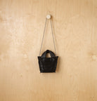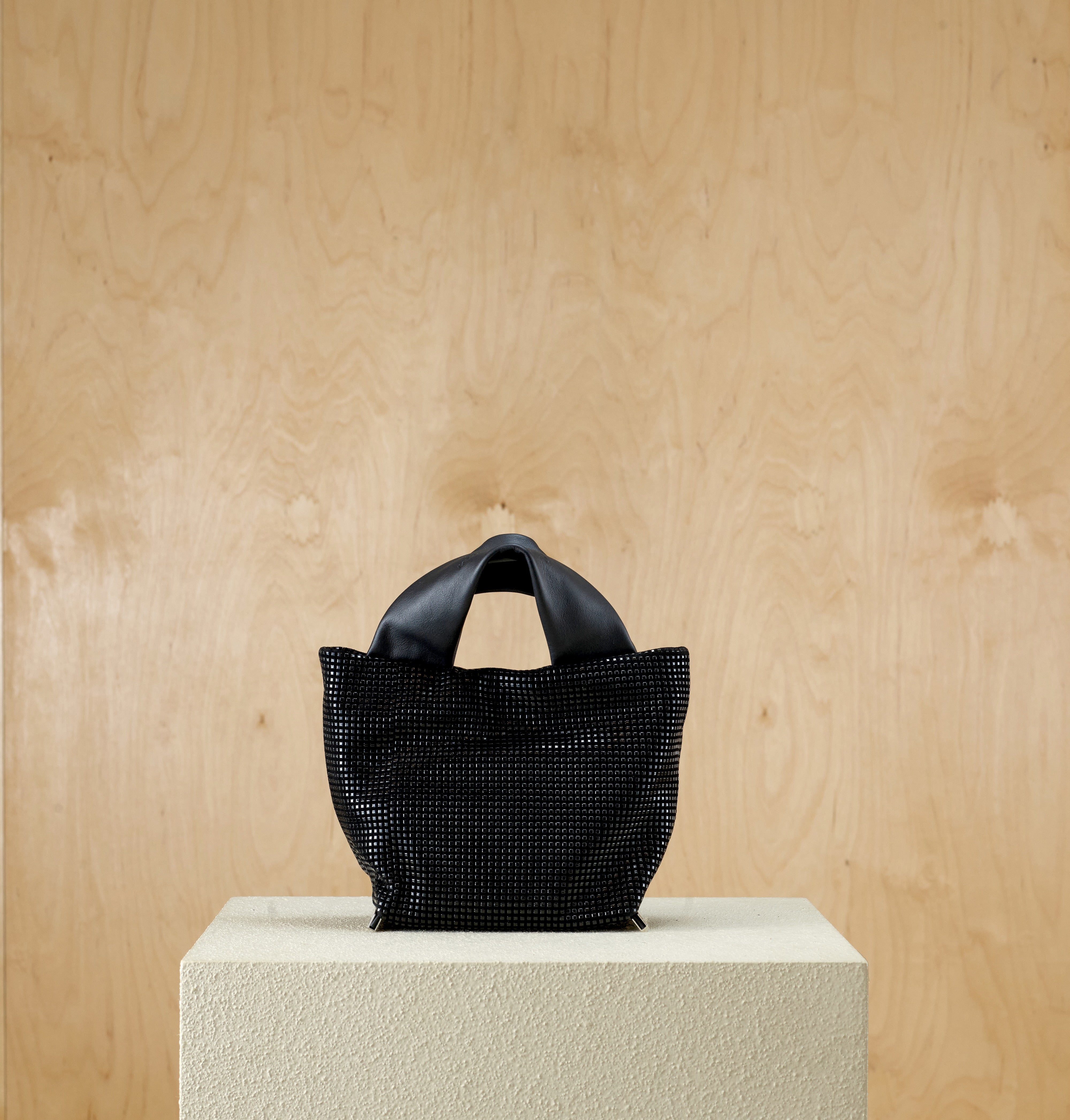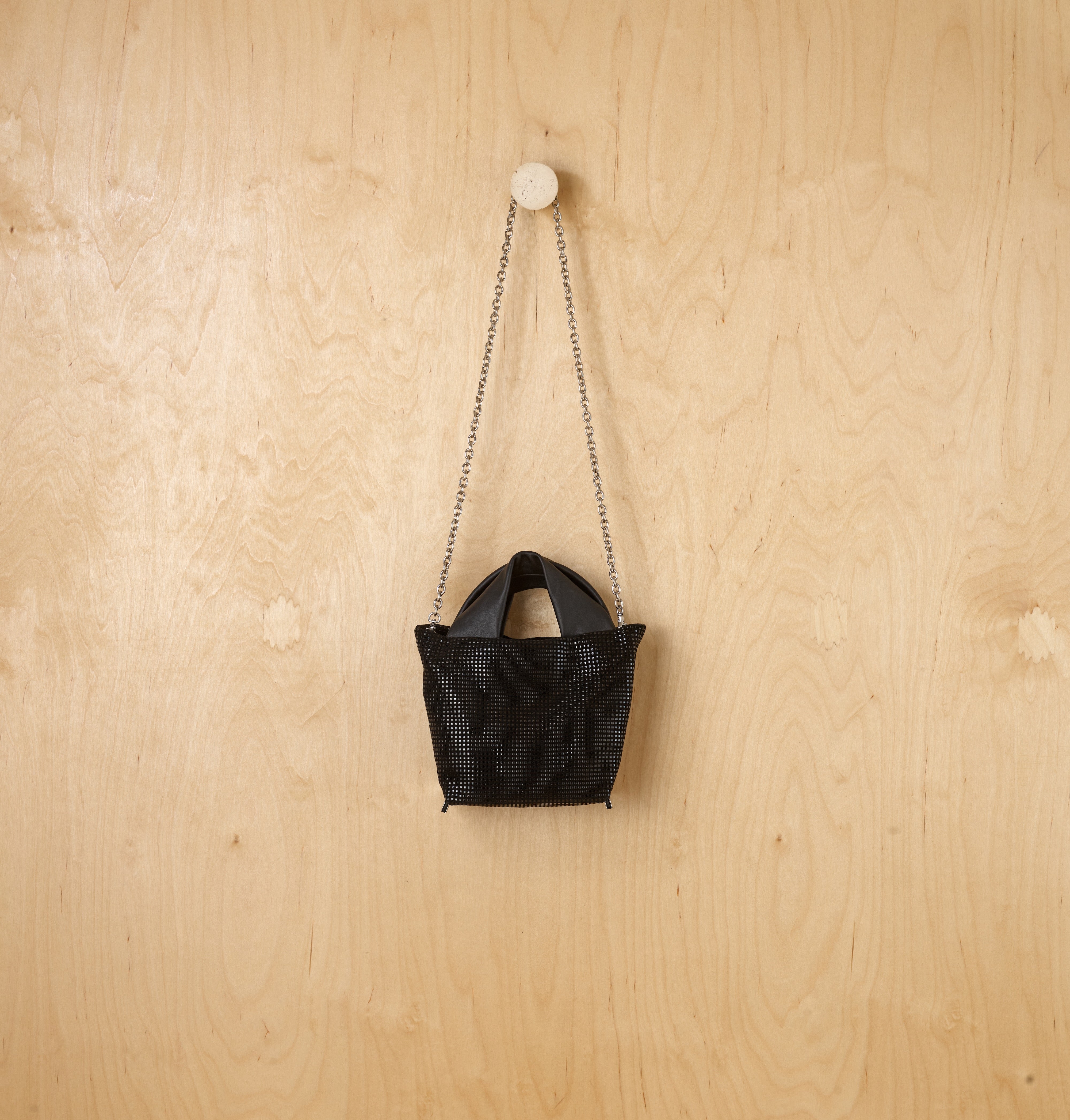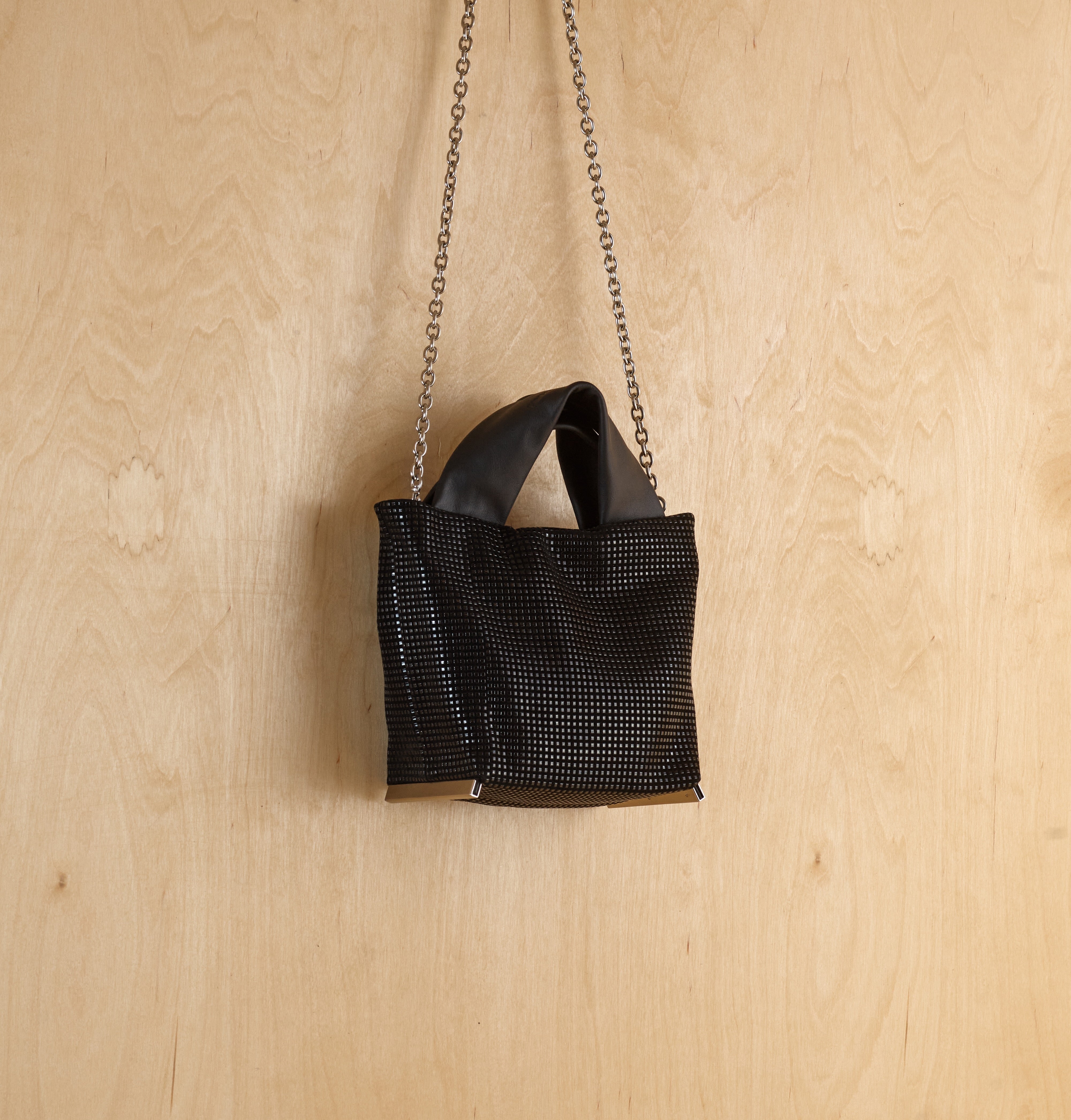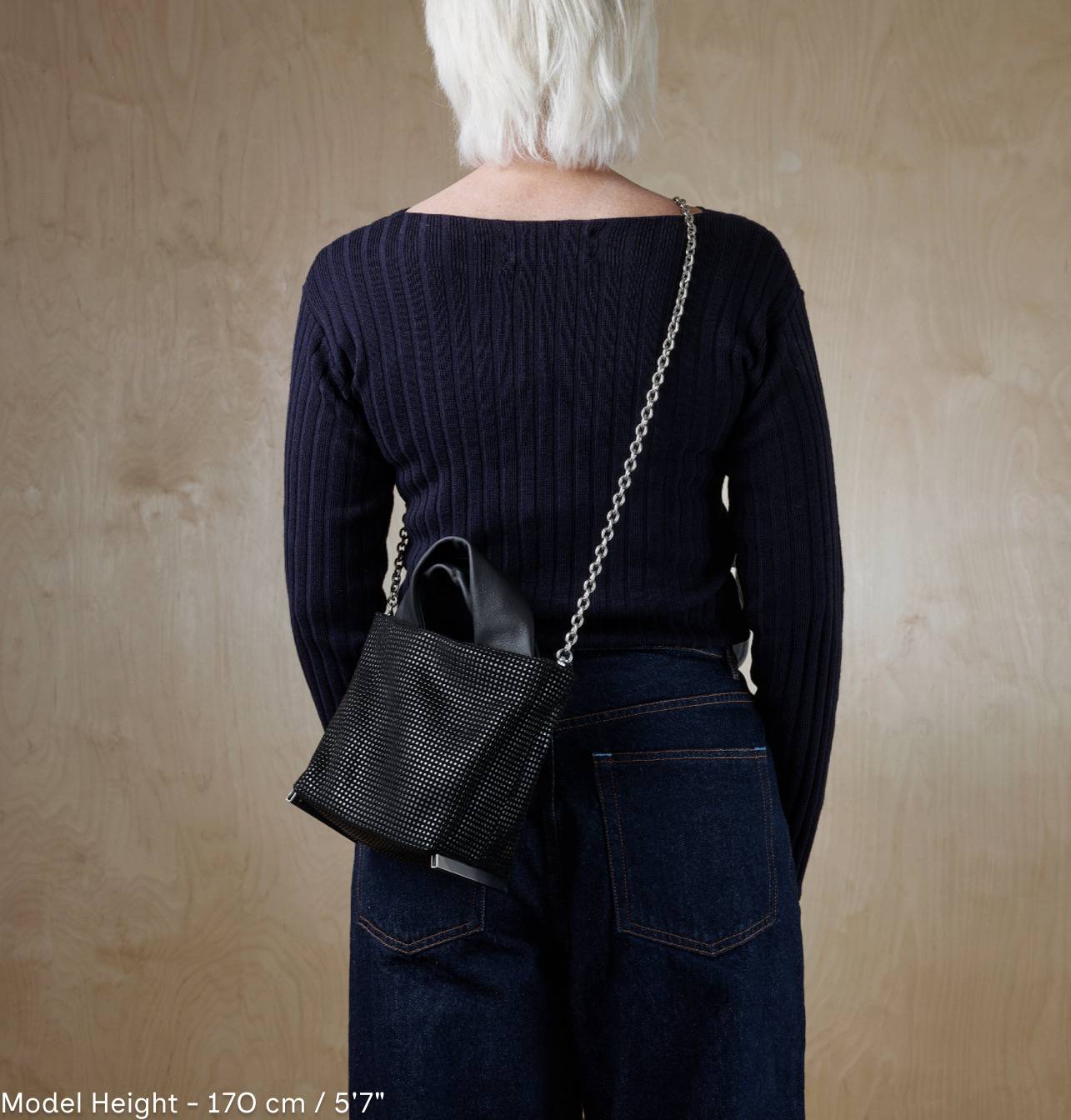 A bag built around a soft shape that maintains a clean, precise silhouette. The handles offer a natural, relaxed grip, while our signature metal feet add a subtle industrial touch that highlights the meeting point between softness and strength. It carries an elegance and presence that feels understated yet clear. A quiet classic. The slim chain allows for crossbody wear, while the handles offer a closer carry option both emphasizing its ability to transition effortlessly into a refined evening look.