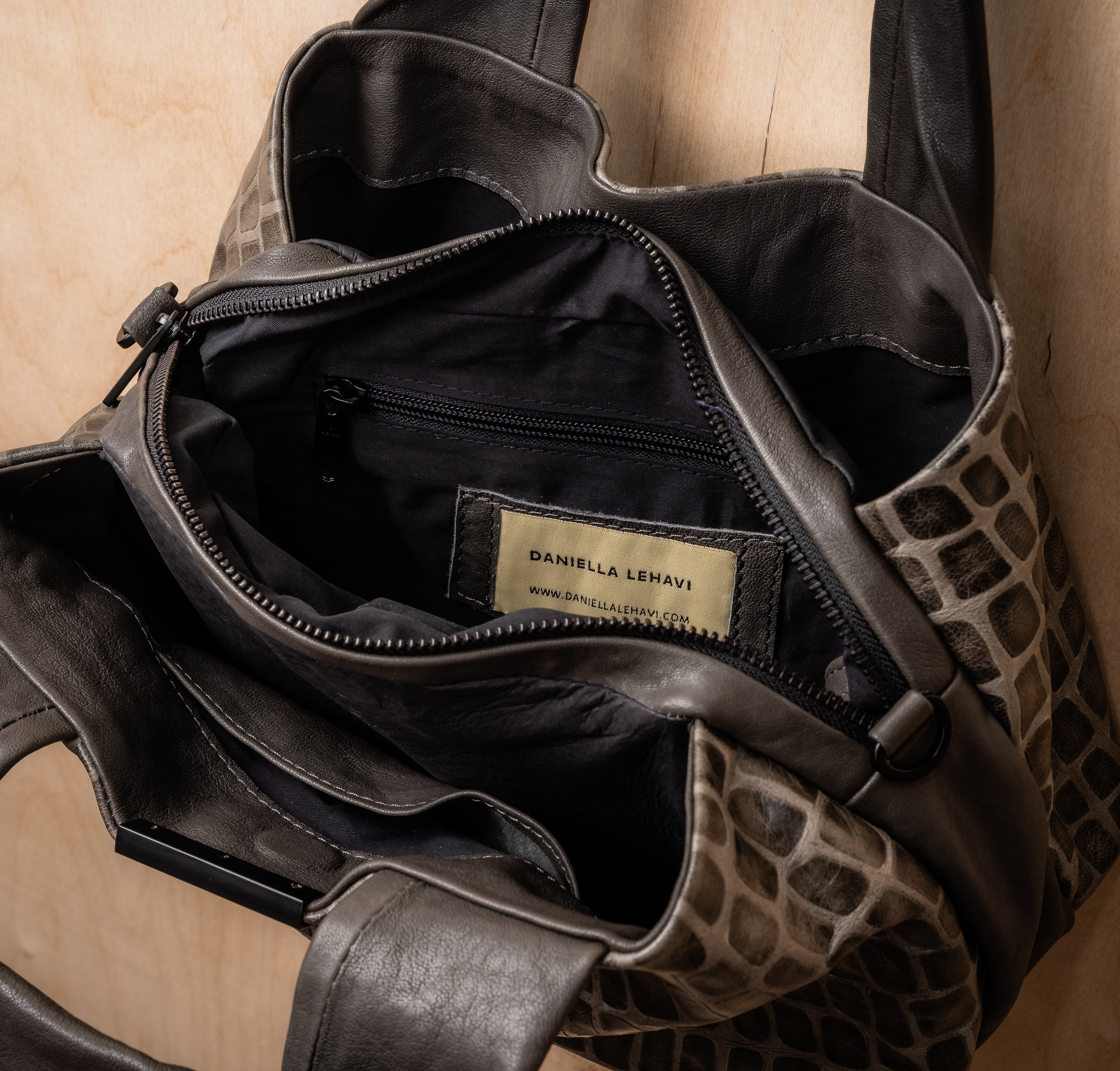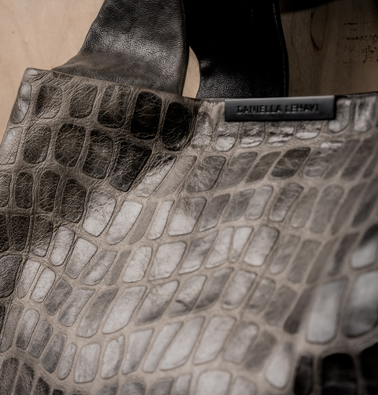 The leather’s texture was developed as a contemporary interpretation of one of Daniella’s most iconic archive leathers, first introduced two decades ago – a creative variation on croco, embossed on soft Italian sheepskin with a geometric pattern, wax finish, and the distinct individuality of handcrafted leather.