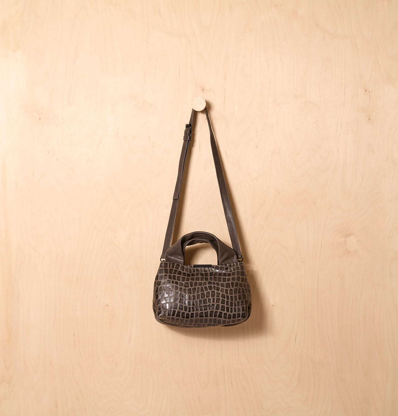You can carry it by hand or over the shoulder, thanks to its adjustable, detachable leather strap. The exterior features a geometric croco-inspired texture, adding subtle depth and a touch of distinction to its timeless design.
