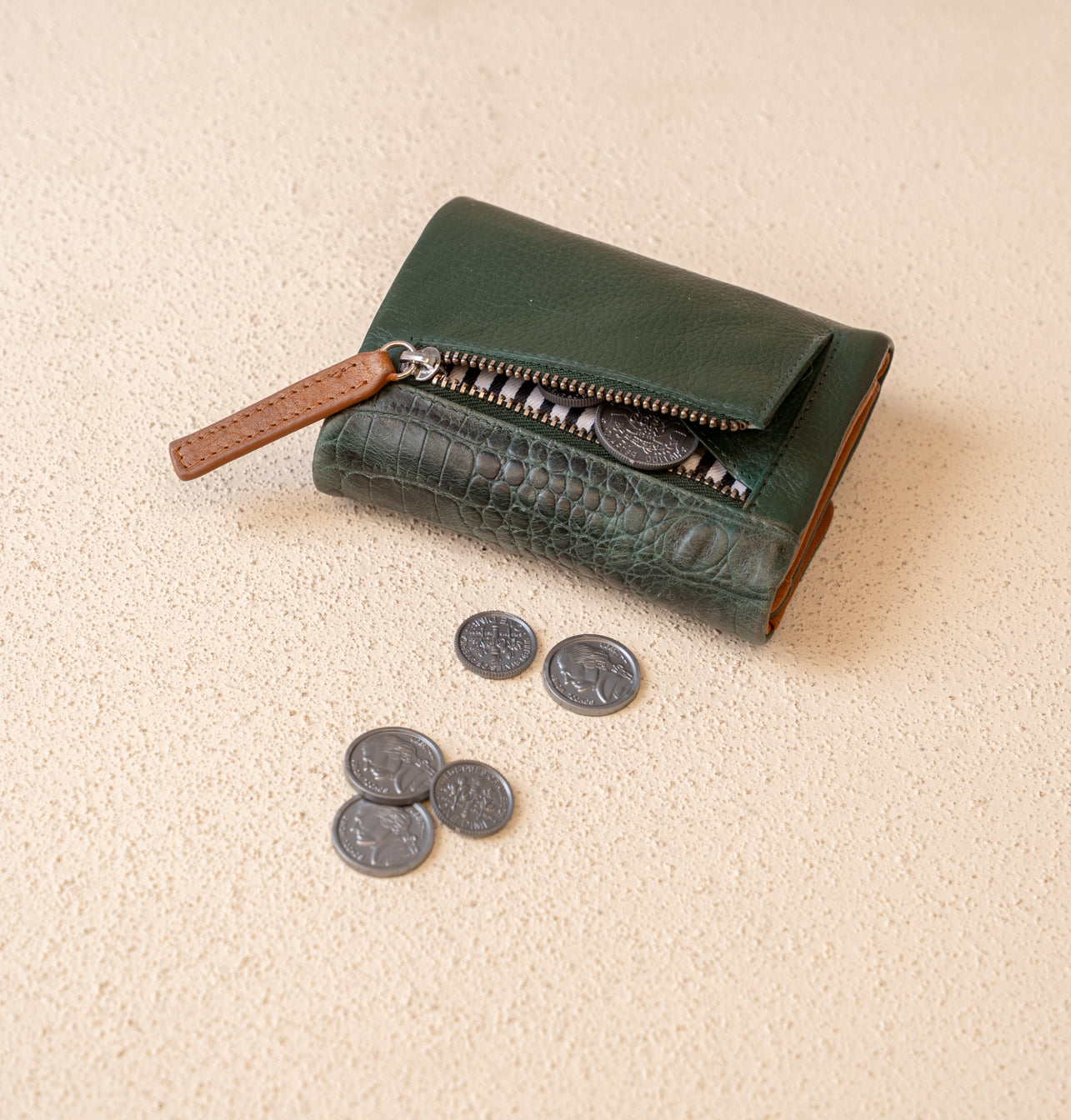 Crafted from a thoughtful mix of leathers in varied textures, it’s both practical and distinctive — a small accessory with a unique character and timeless appeal.