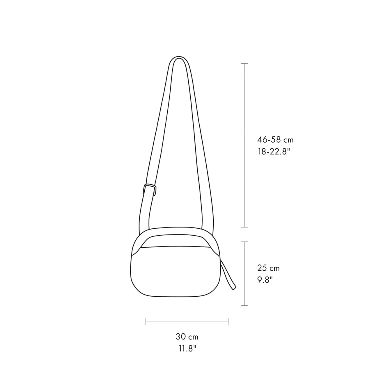 - Adjustable strap length: 100–120 cm / 39.4–47.2″, Strap drop: 46–58 cm / 18.1–22.8″