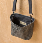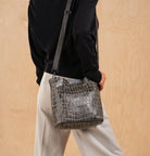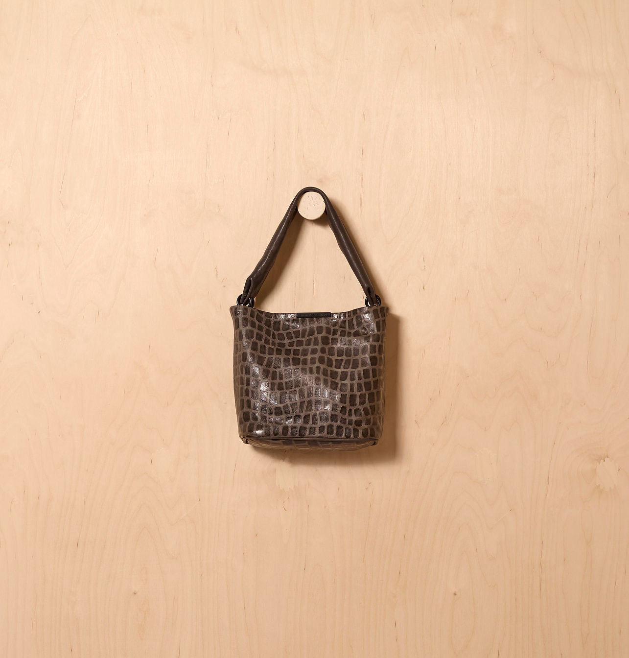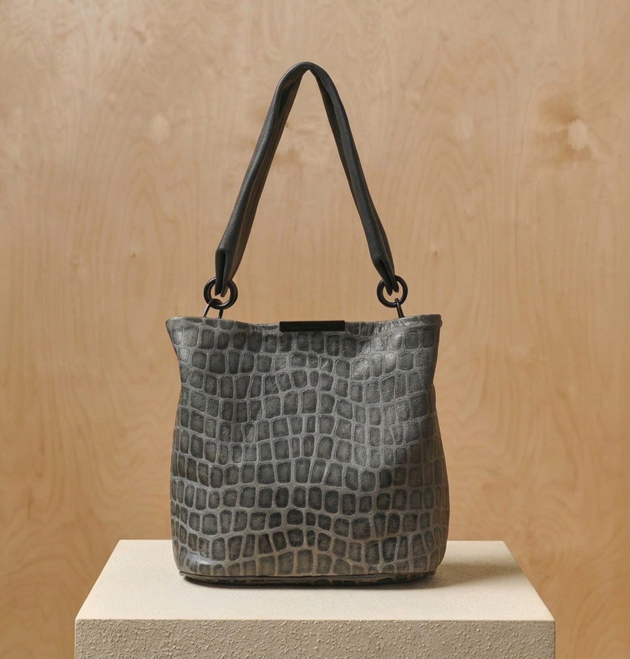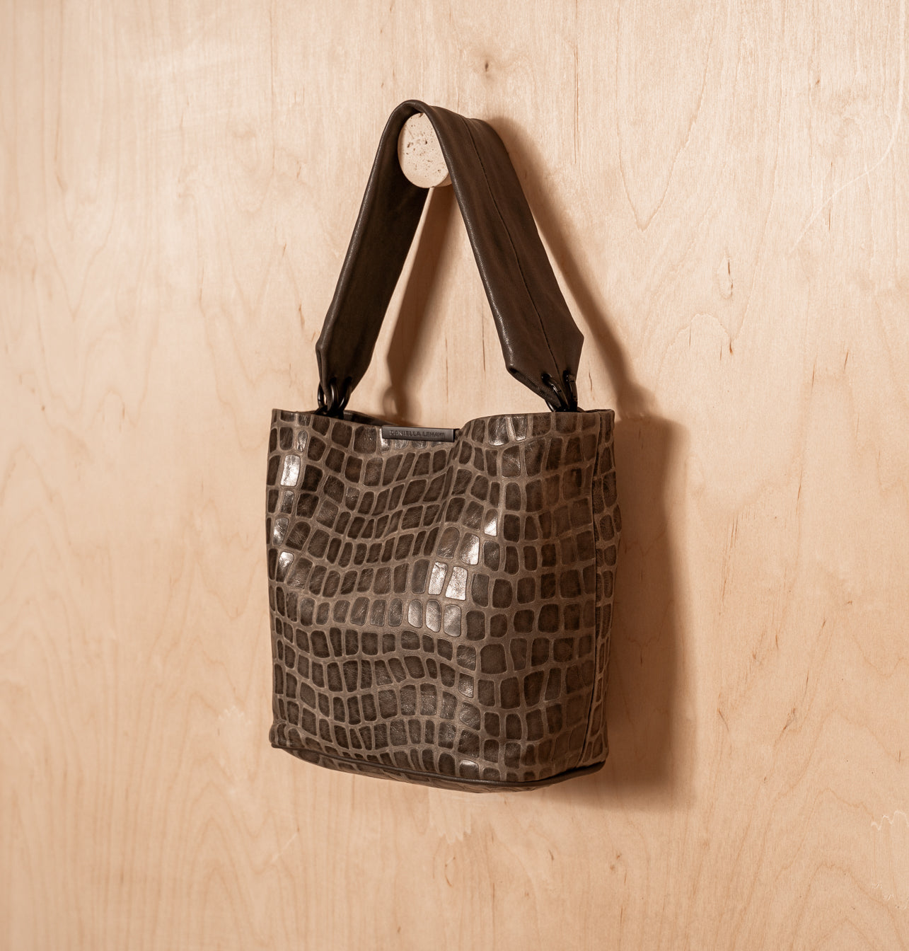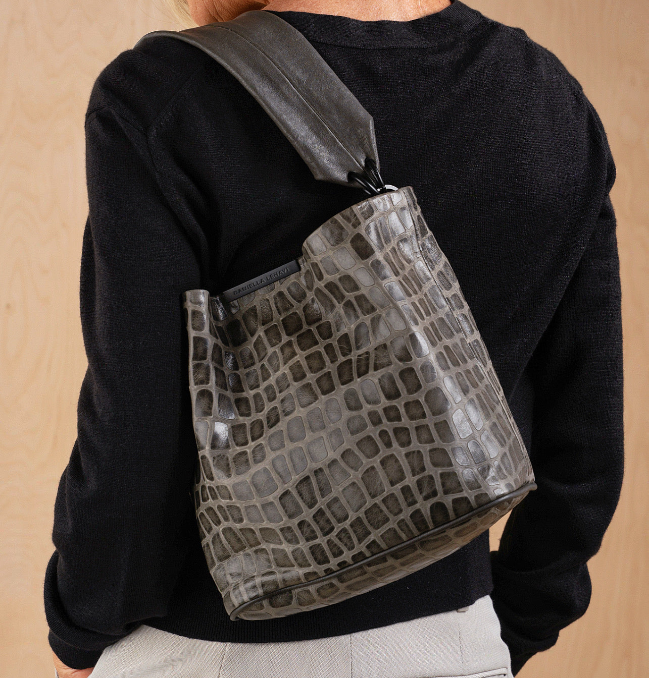 The leather’s texture was developed as a contemporary take on one of Daniella’s most iconic archive leathers, first introduced two decades ago – a creative variation on croco, embossed on supple Italian sheepskin with a geometric pattern, waxed finish, and the distinct feel of handcraft.