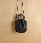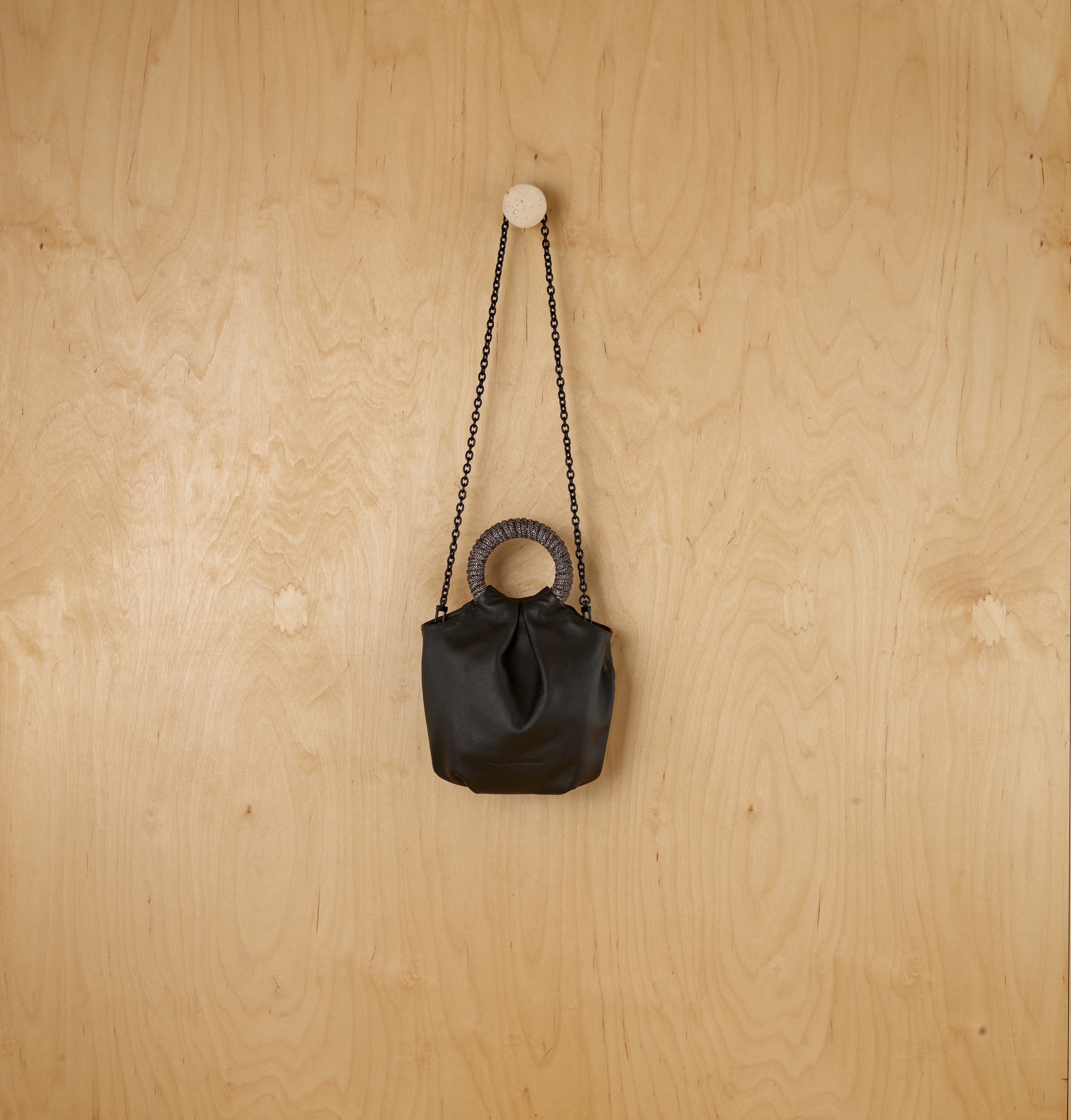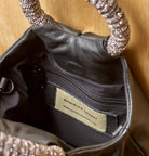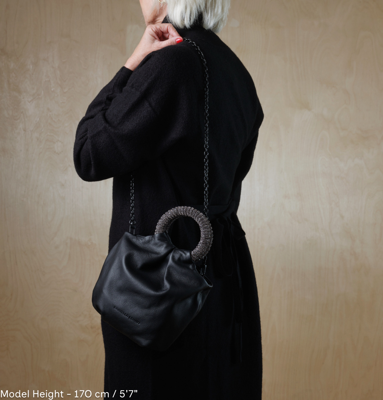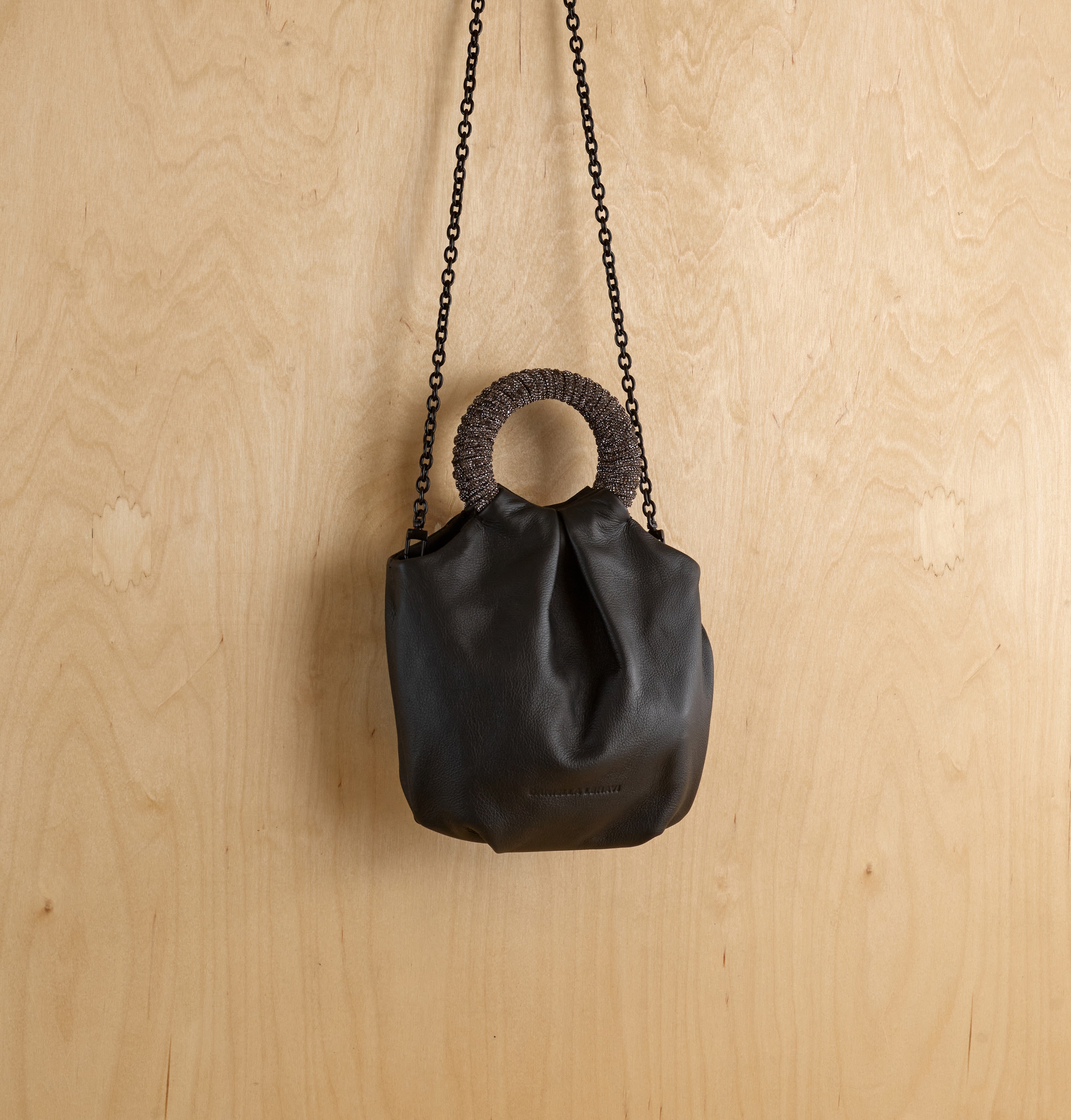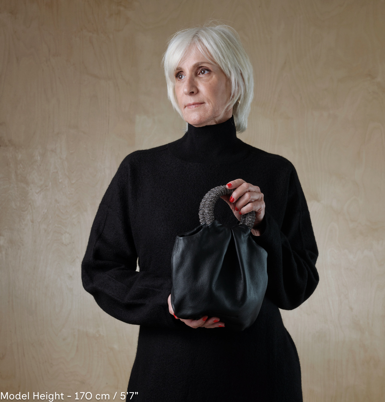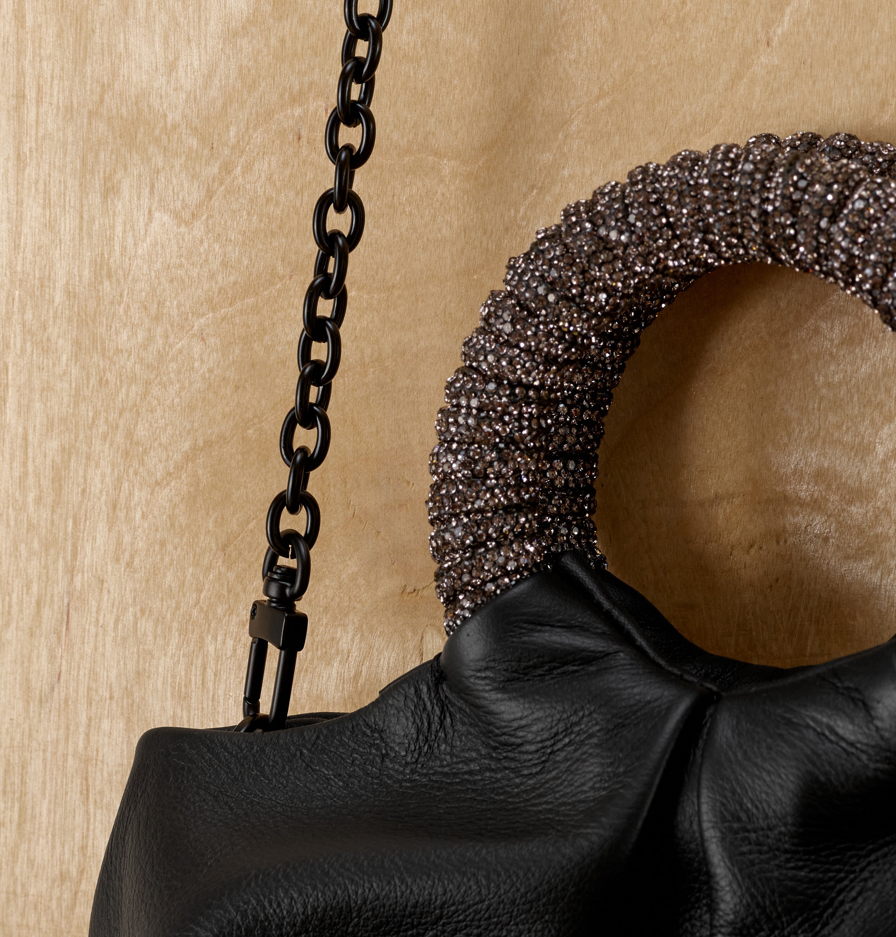 A small, elegant clutch that combines soft leather with a crystal handle, creating a festive yet clean look. The gathered construction around the handle forms an organic, flowing shape that gives the bag a natural and refined presence. It can be worn on the wrist or across the body with its delicate, refined chain strap that blends harmoniously with the overall design.