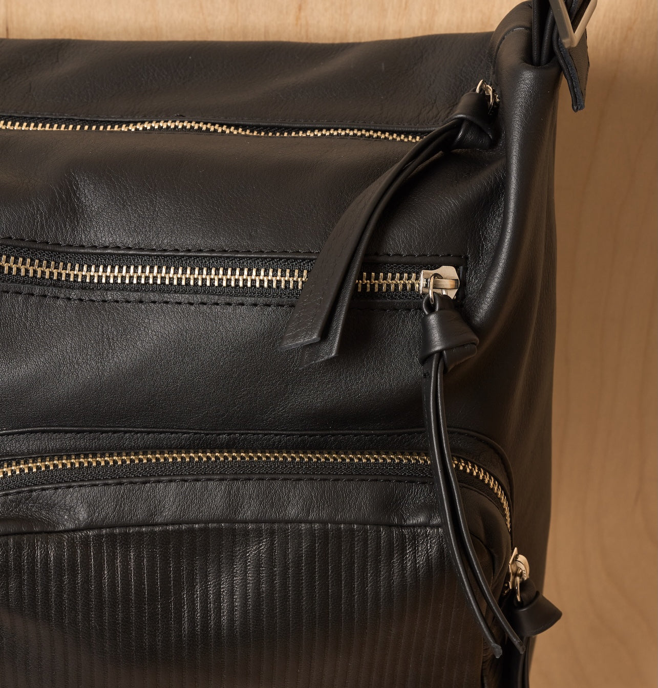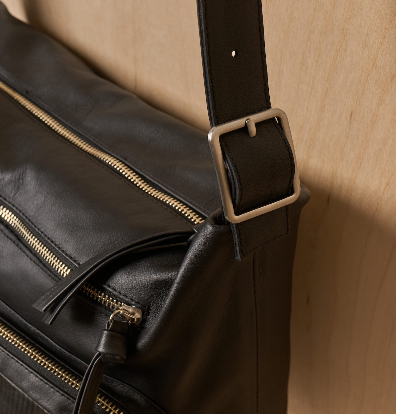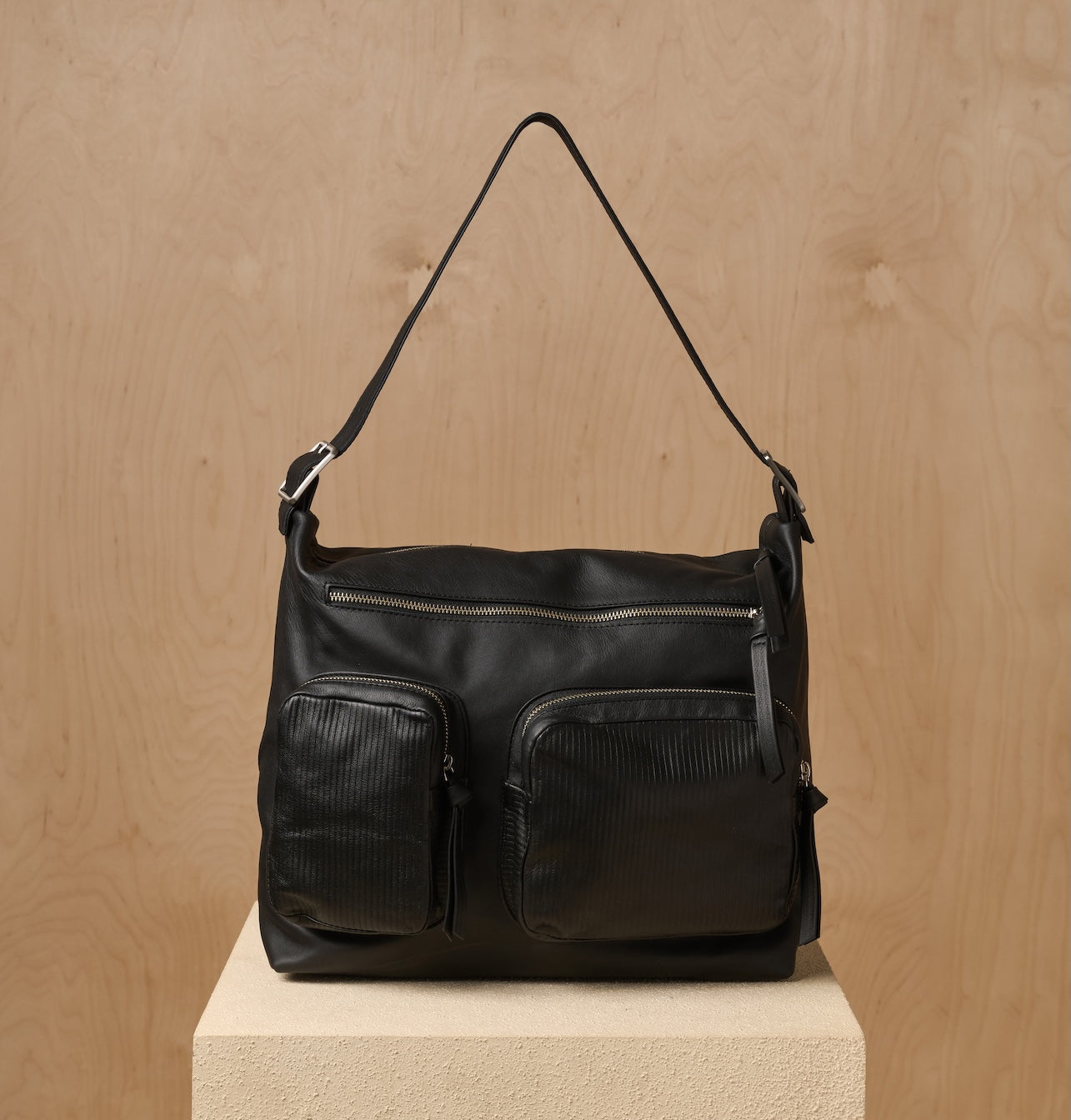 The generous shape and thoughtfully designed compartments allow for easy organization and everyday practicality. External zippers and pockets add both visual depth and material richness, turning functionality itself into a defining design element. With its wide strap and supple leather body, this bag feels light and comfortable – a perfect companion for daily use.