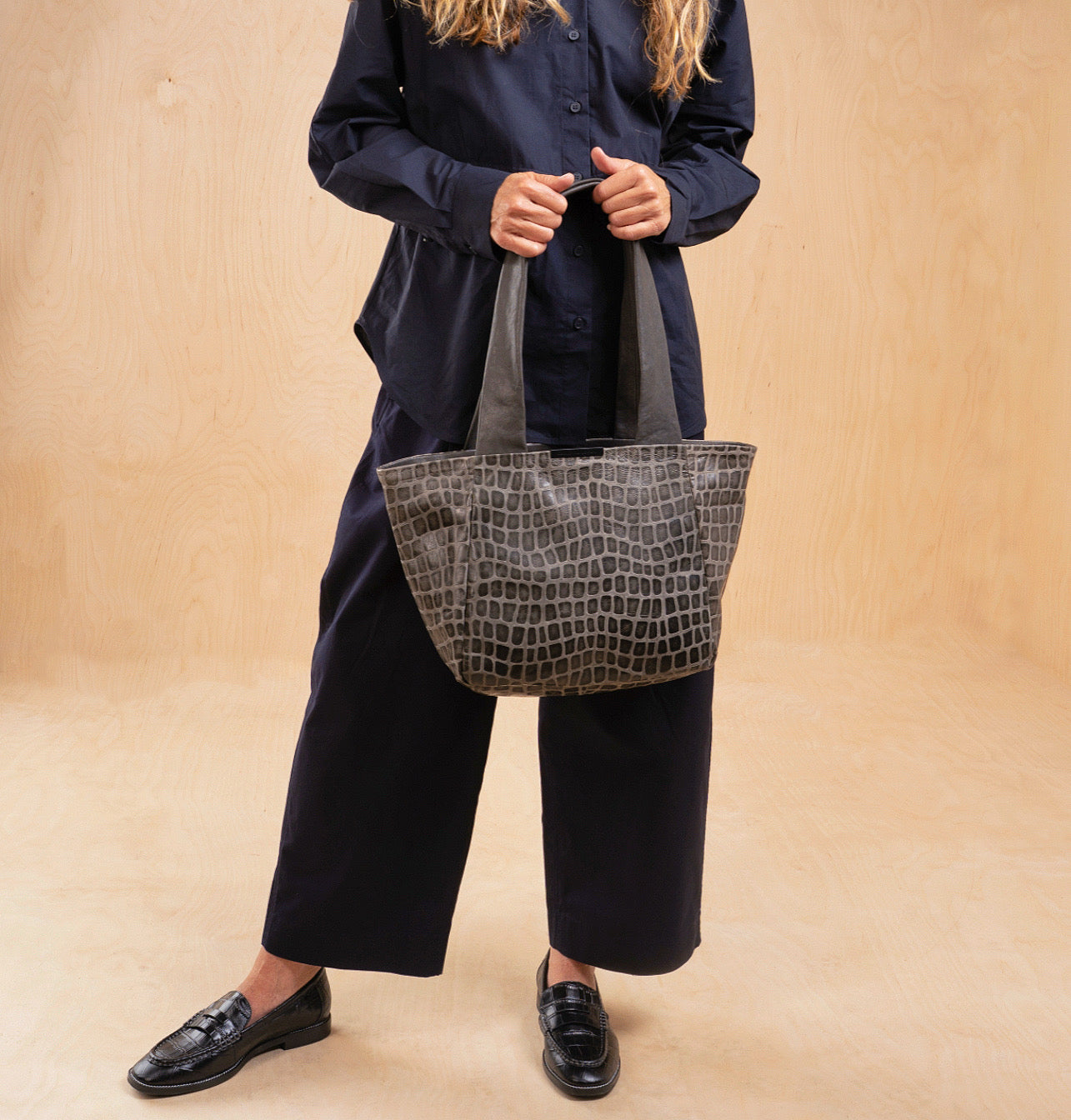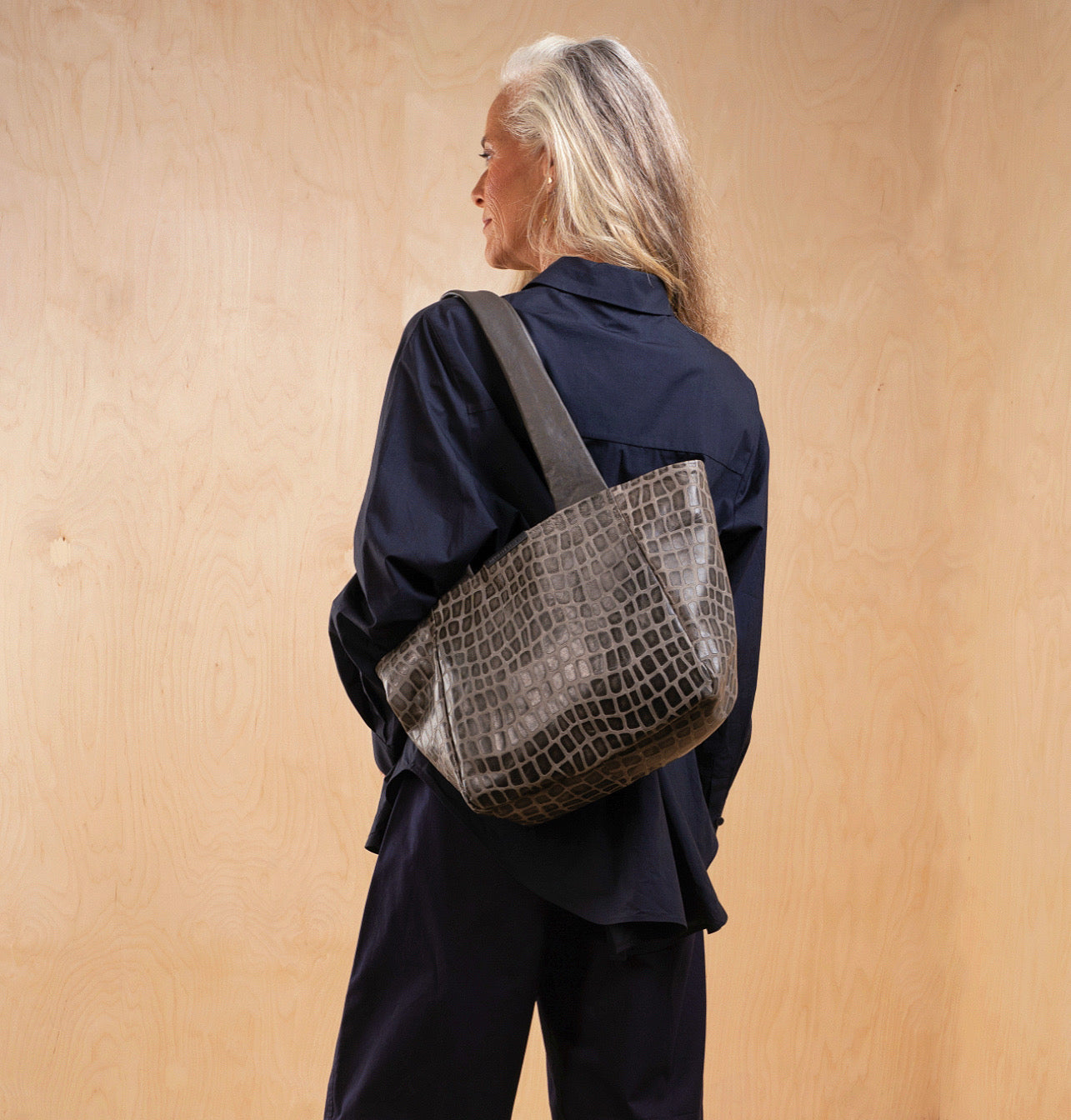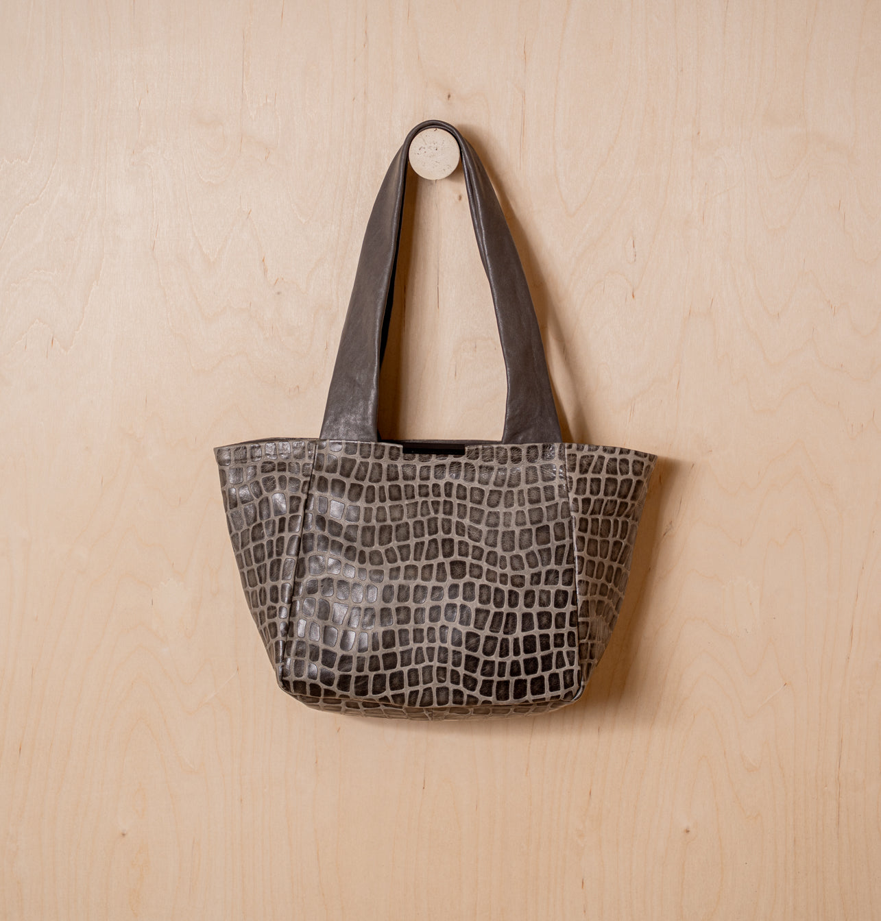 The leather’s texture was developed as a contemporary interpretation of one of Daniella’s most iconic archive leathers, first introduced two decades ago – a creative variation on croco, embossed on soft Italian sheepskin with a geometric pattern, wax finish, and the distinct individuality of handcrafted leather.