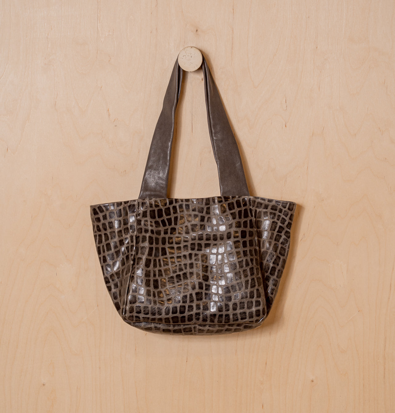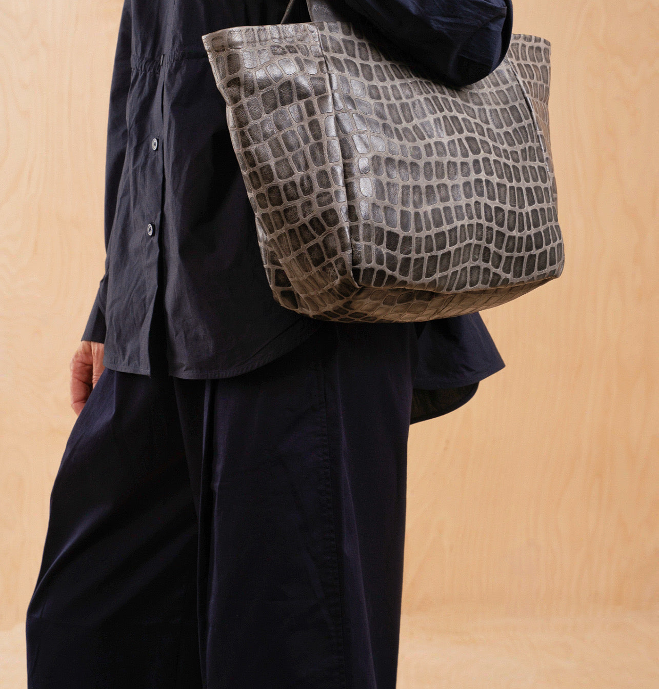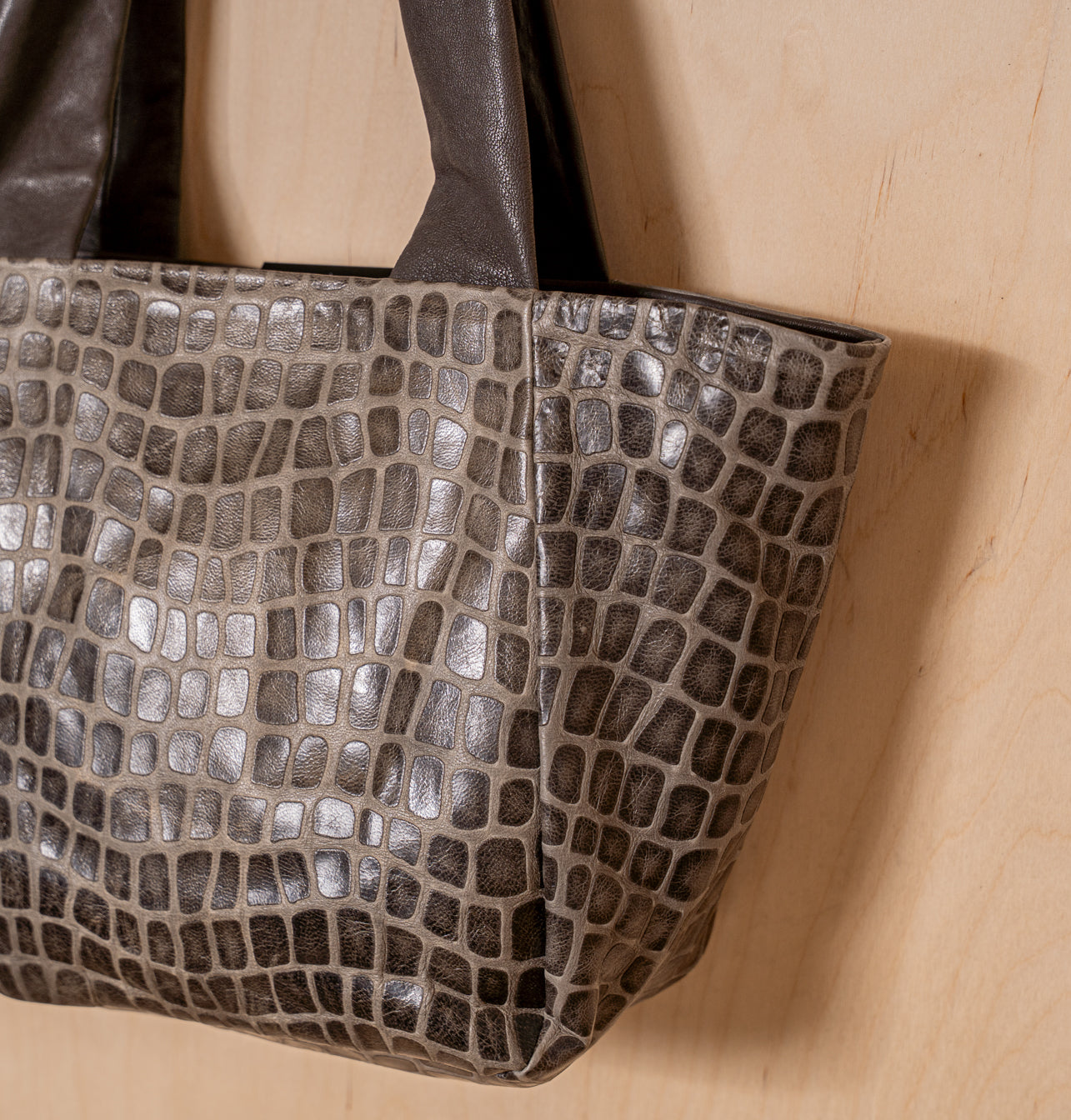 The leather’s texture was developed as a contemporary interpretation of one of Daniella’s most iconic archive leathers, first introduced two decades ago – a creative variation on croco, embossed on soft Italian sheepskin with a geometric pattern, wax finish, and the distinct individuality of handcrafted leather.