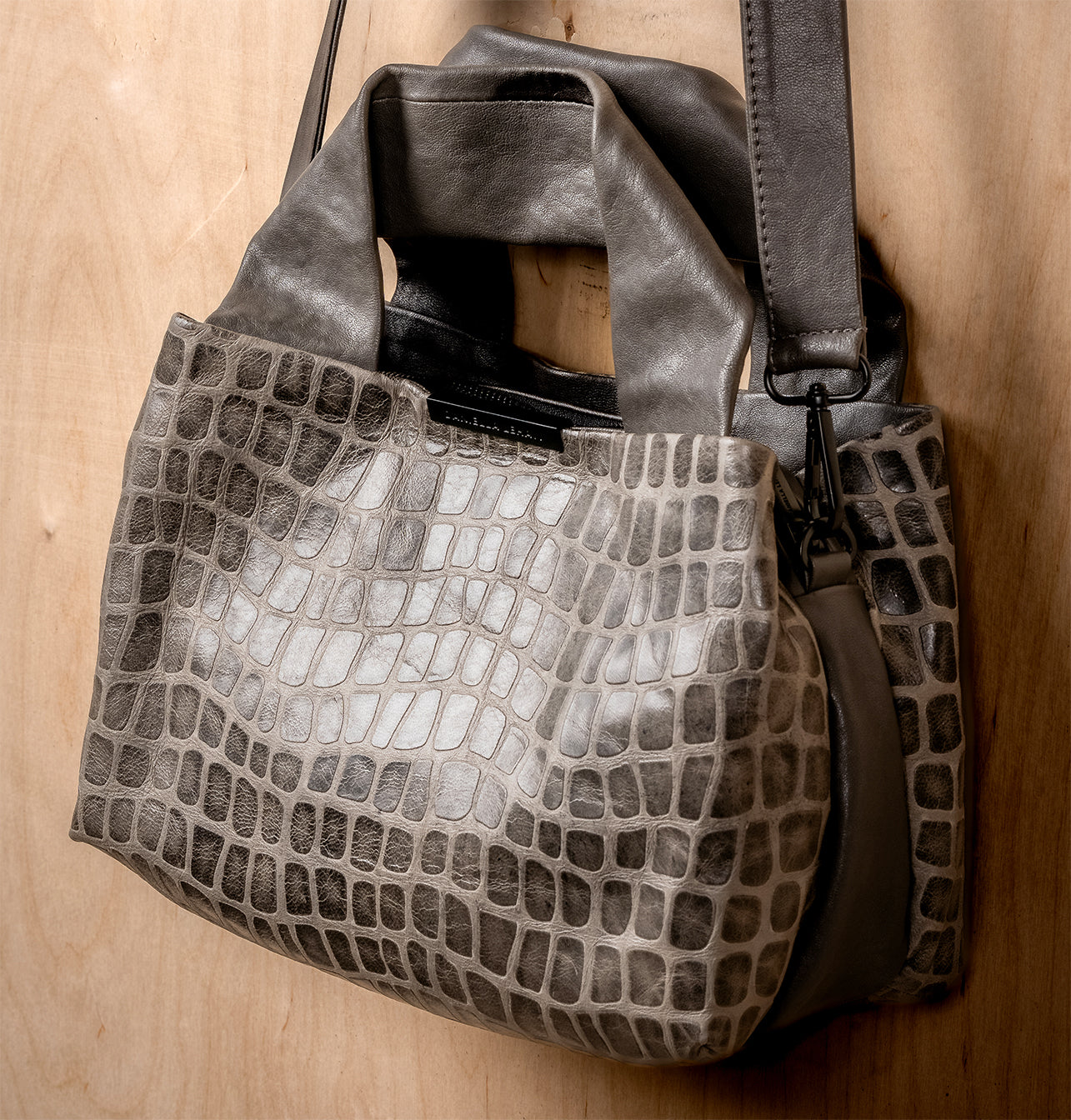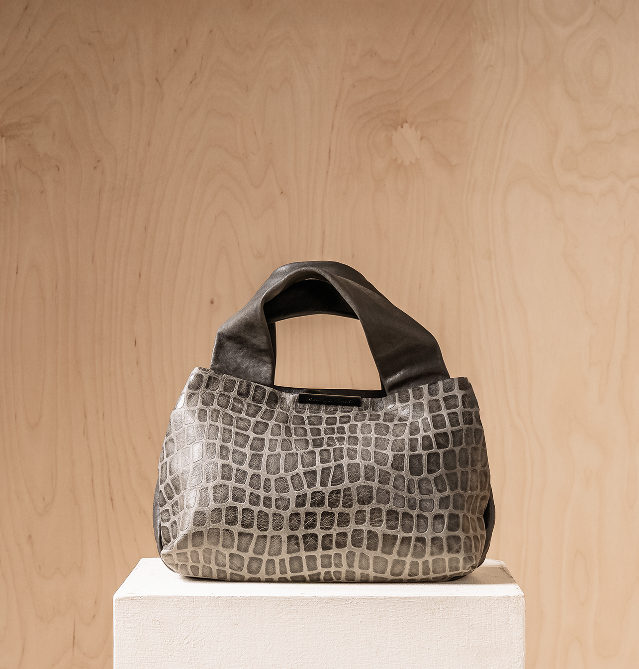 The leather’s texture was developed as a contemporary interpretation of one of Daniella’s most iconic archive leathers, first introduced two decades ago – a creative variation on croco, embossed on soft Italian sheepskin with a geometric pattern, wax finish, and the distinct individuality of handcrafted leather.