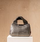 You can carry it by hand or over the shoulder, thanks to its adjustable, detachable leather strap. The exterior features a geometric croco-inspired texture, adding subtle depth and a touch of distinction to its timeless design.