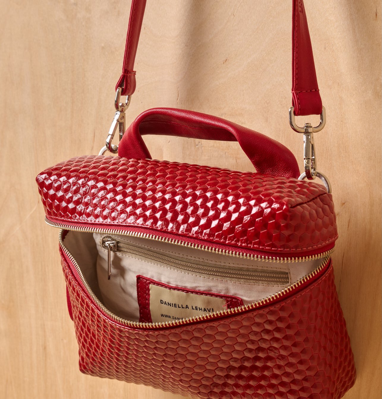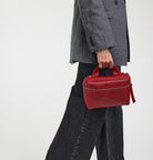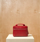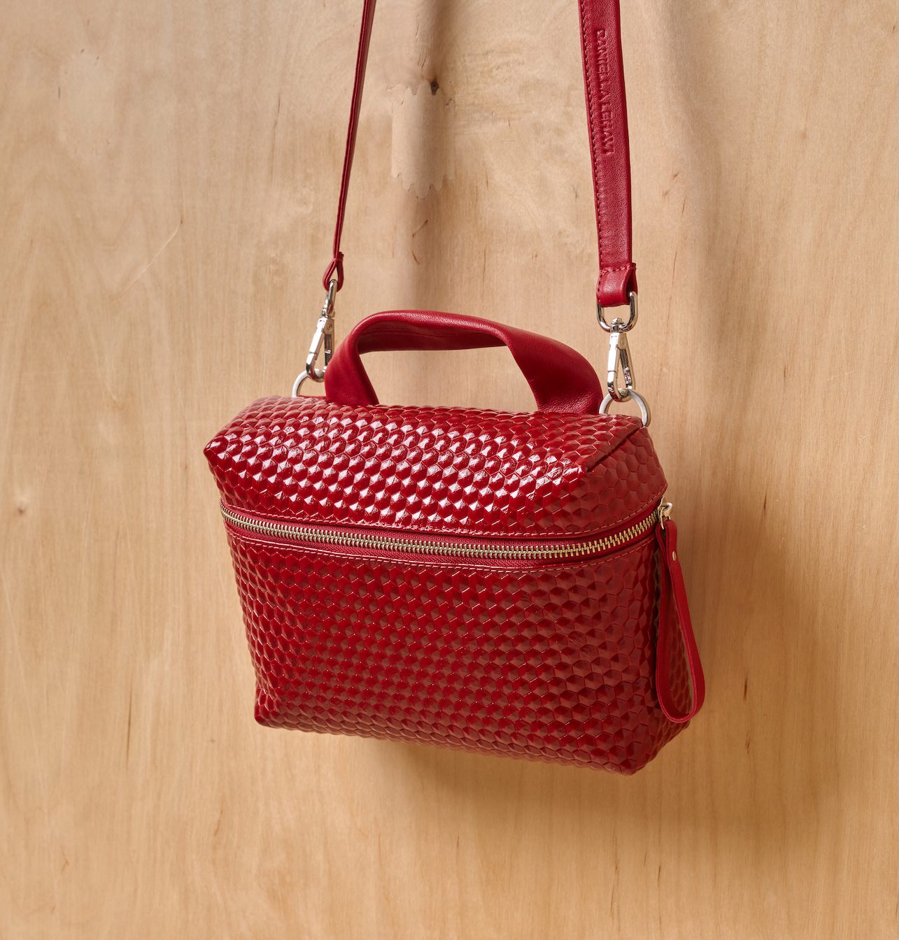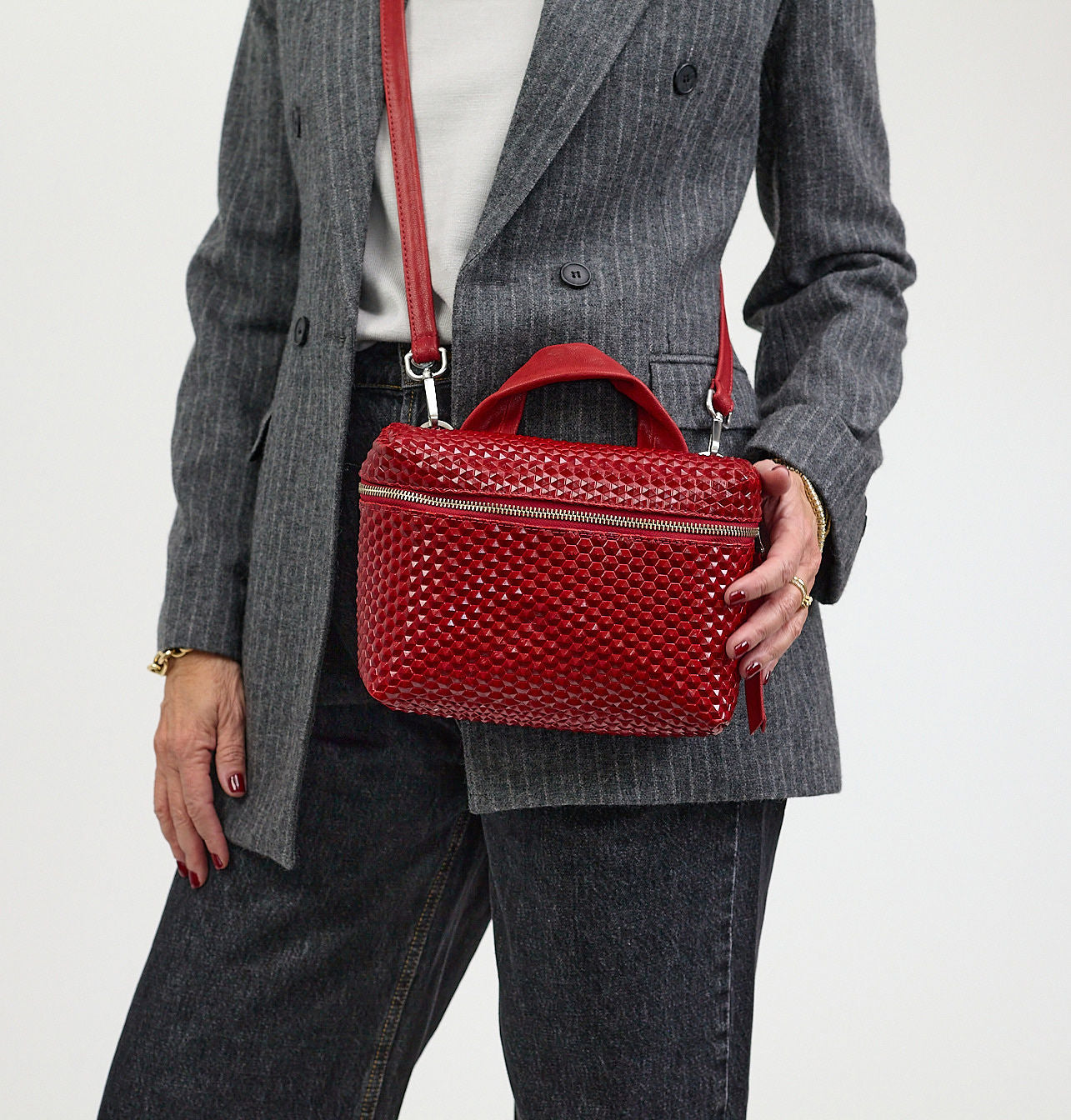 A structured, box shaped bag with precise proportions and clean lines. Its defined form maintains a polished look, while the texture adds depth and subtle movement. It can be carried by its top handle or adjustable strap, offering a clean yet confident design that stays timeless across seasons and styles.