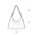 - Two detachable straps: short shoulder strap with knotted detail, length 50 cm (19.7″), 30 cm (11.8″) drop; long adjustable strap, 66–128 cm (26–50.4″)