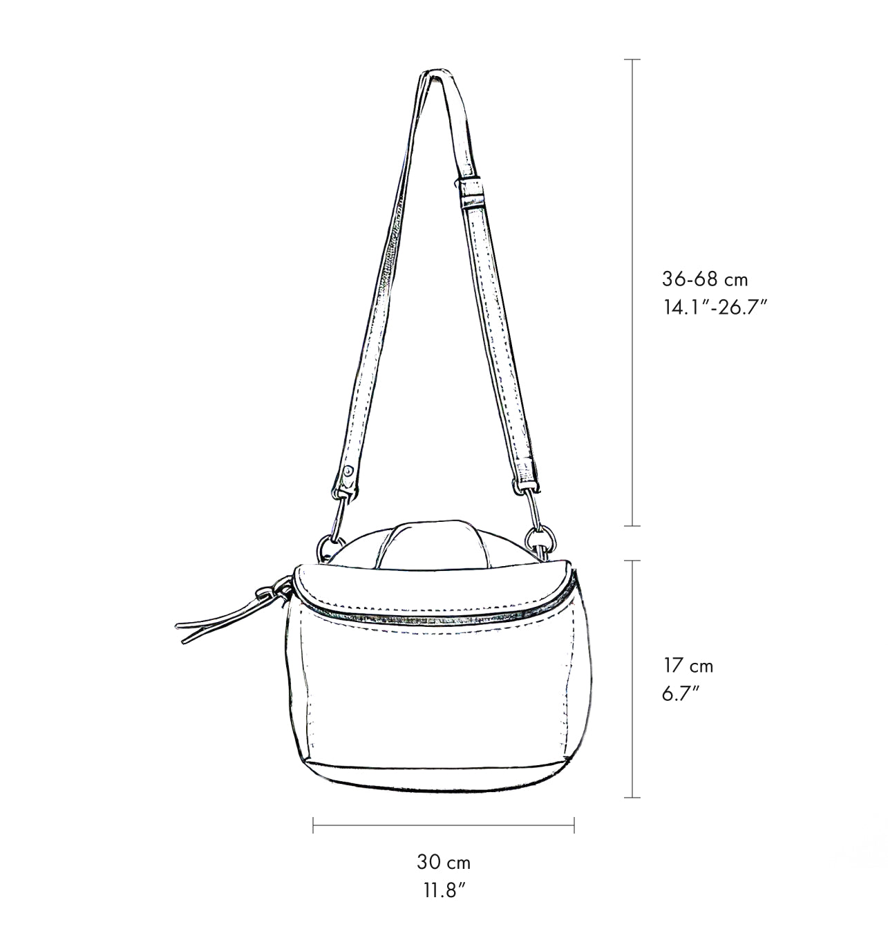 Depth: 10 cm (4") - Adjustable leather strap length: 73-116 cm (28.7"-45.6")