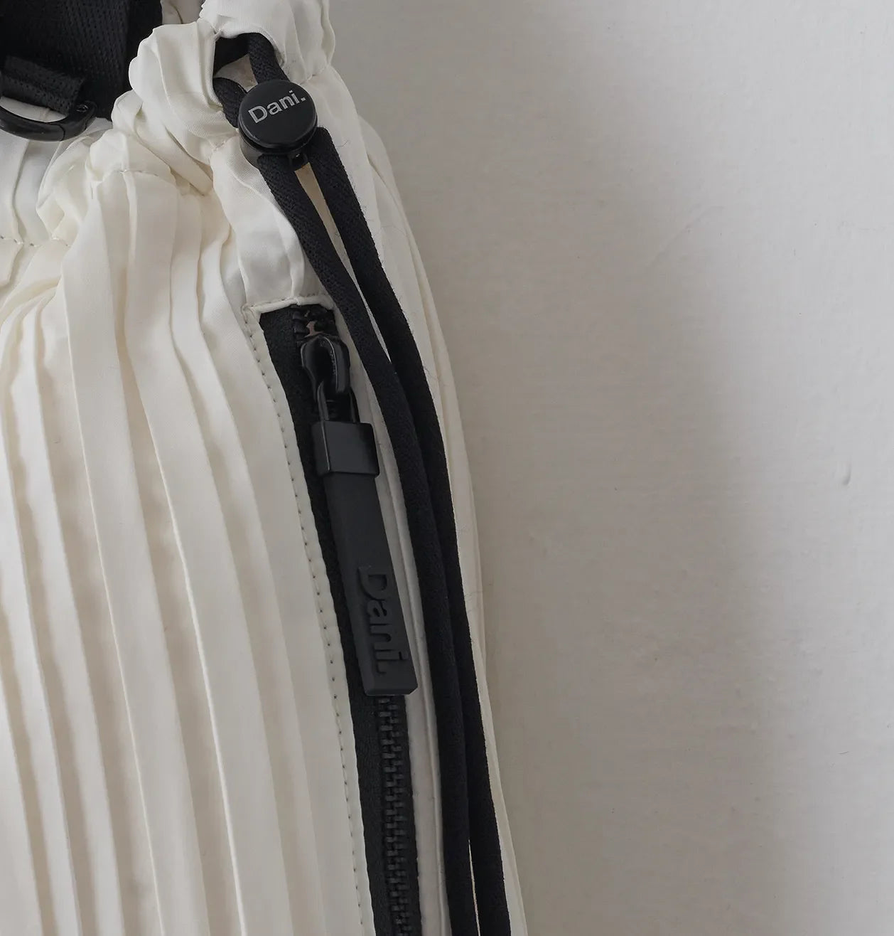 A softly structured bucket bag made of plissé fabric. The shape is clean and comfortable for everyday use.