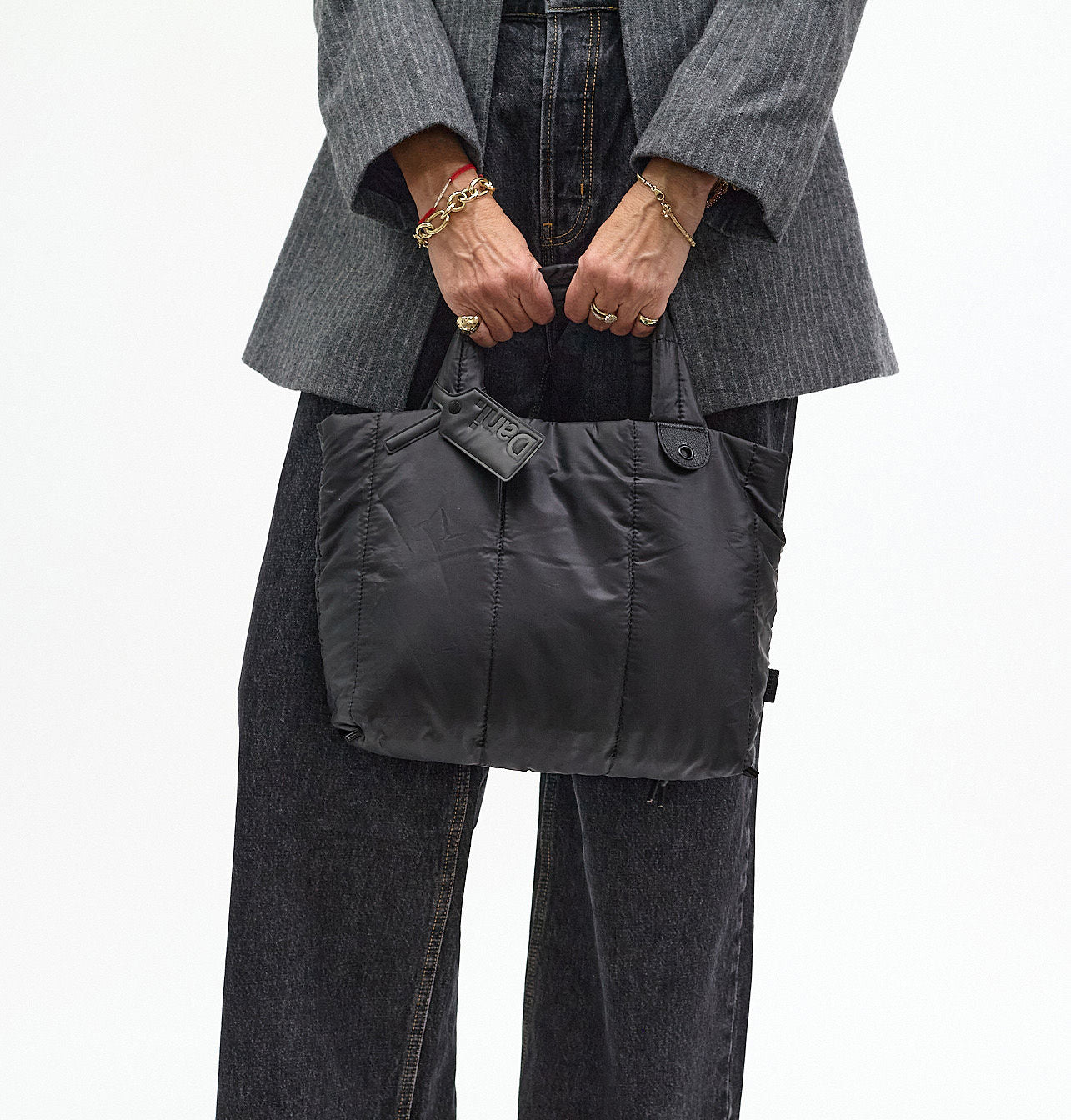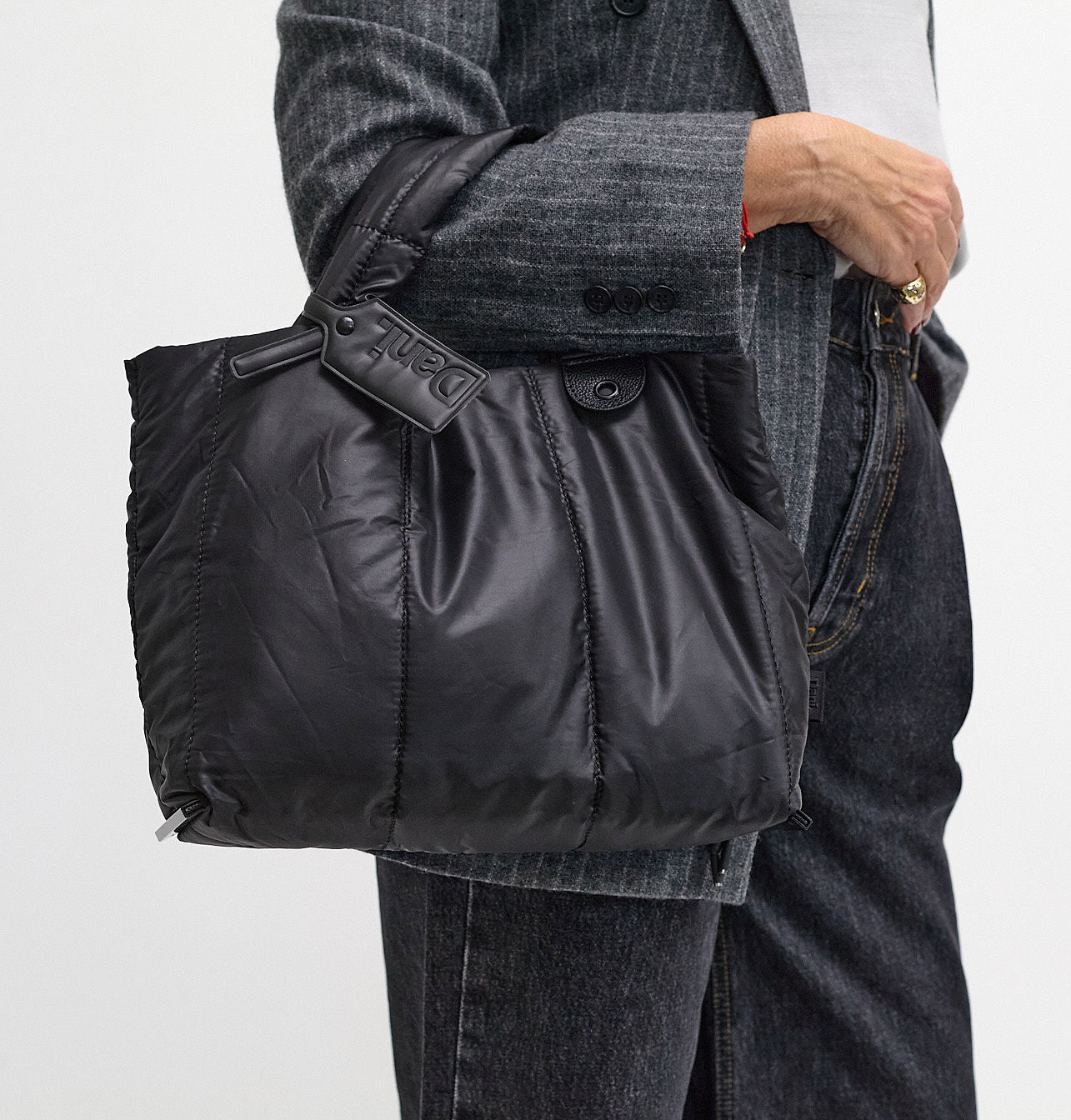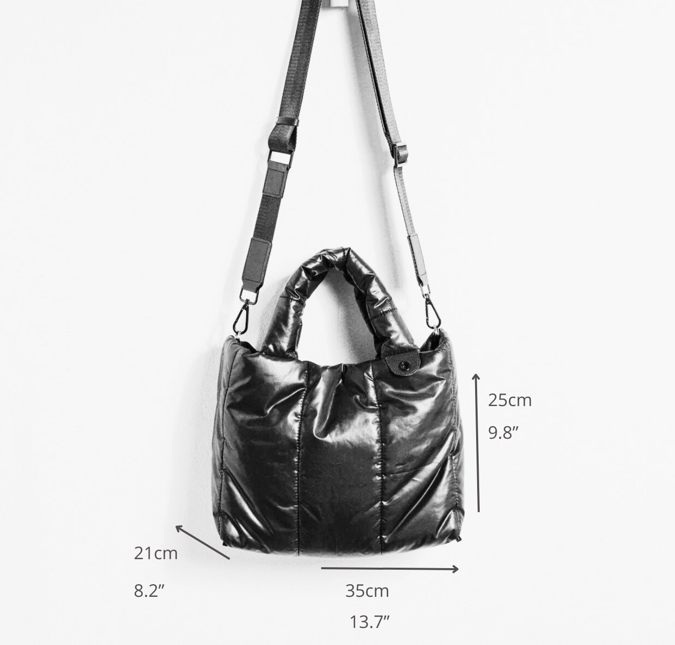 The Quilt Medium Tote bag is crafted from recycled vegan Nylon, offering a sustainable yet luxurious touch. Its soft quilted texture adds dimension and a subtle sheen. The bag has one spacious main compartment with a small inside zipped pocket and an external zipped pocket.