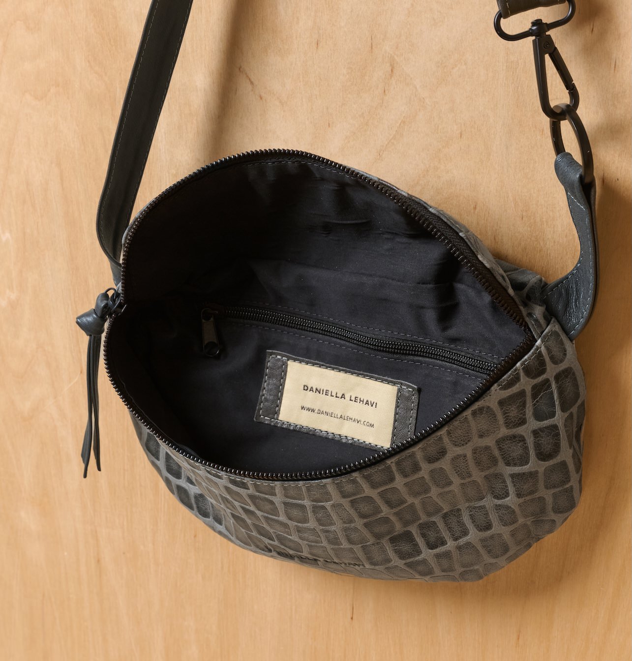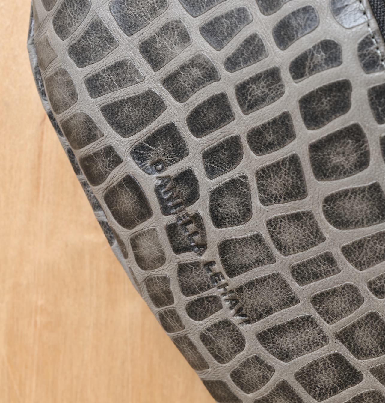 The leather’s texture was developed as a contemporary interpretation of one of Daniella’s most iconic archive leathers, first introduced two decades ago – a creative variation on croco, embossed on soft Italian leather with a geometric pattern, wax finish, and the distinct individuality of handcrafted material.